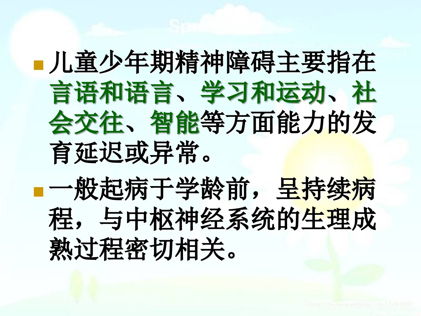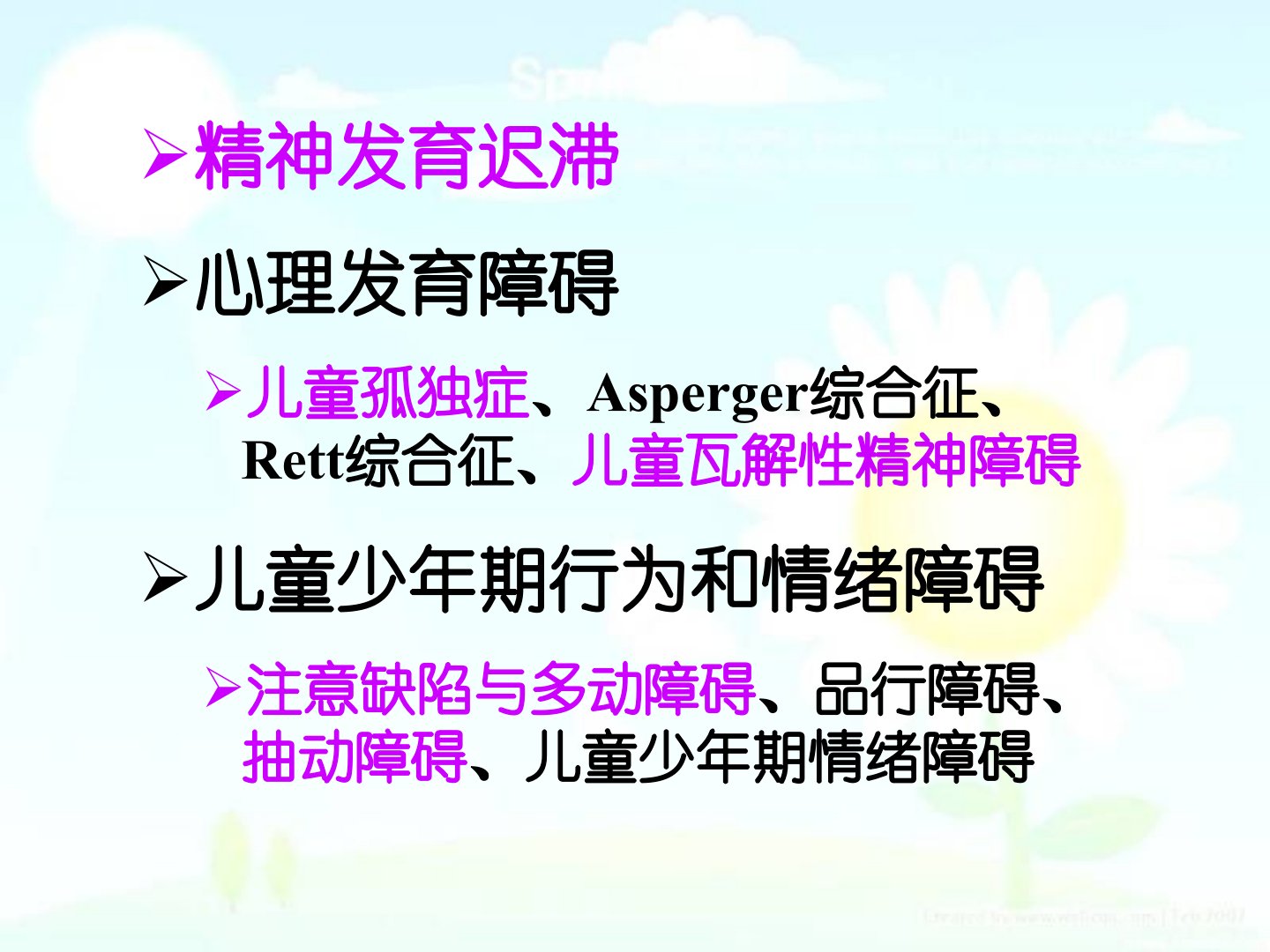 儿童少年期精神障碍涉及言语、学习、运动、社交及智能等多方面的发育异常起病于学龄前与中枢神经系统成熟密切相关。精神发育迟滞是中枢神经系统18岁前发育成熟前起病的一类疾病特征为智能低下和社会适应困难由染色体异常、遗传、环境因素等导致临床分轻度、中度、重度、极重度四级。治疗重在预防以教育和康复训练为主必要时对症治疗。心理发育障碍指儿童心理发育受不良因素影响导致迟缓、倒退或偏离正常。心理发育障碍包括特定性发育障碍和广泛性发育障碍后者如儿童孤独症表现为社交、语言障碍及刻板行为。儿童少年期行为和情绪障碍包括注意缺陷与多动障碍、品行障碍等部分症状随年龄增长缓解。注意缺陷与多动障碍以注意力不集中、活动过多和冲动为主要特征治疗包括教育、心理、行为矫正和药物。抽动障碍以不自主、无目的抽动为主要表现包括短暂性、慢性及Tourette综合征治疗以药物为主辅以心理治疗。