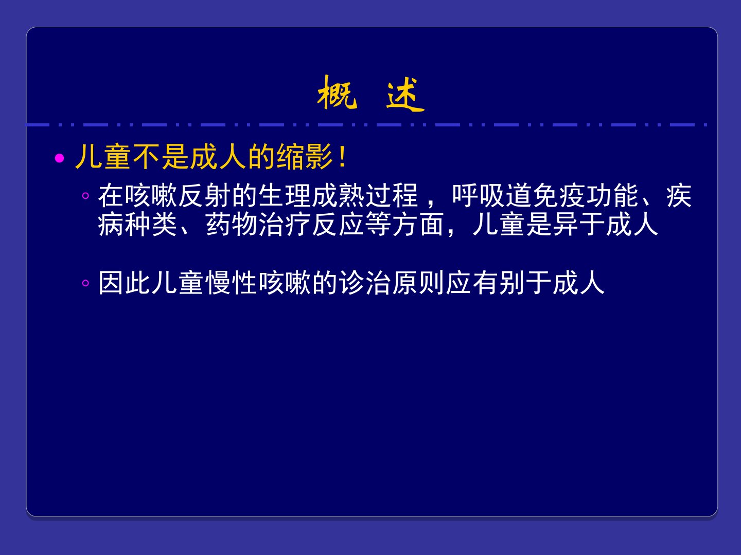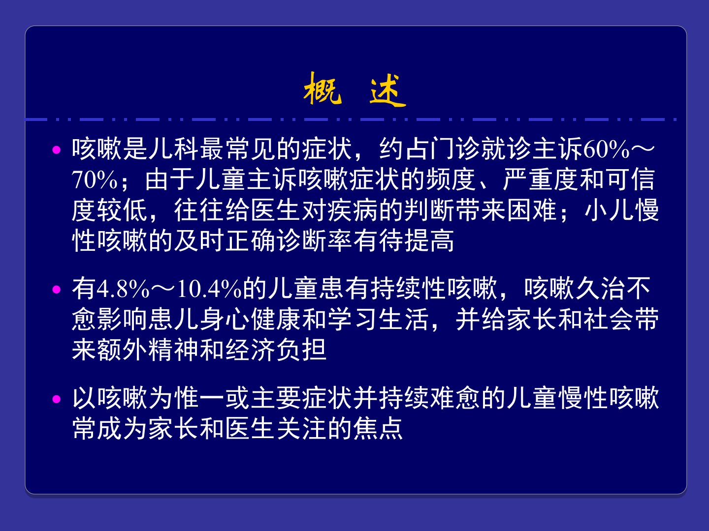 儿童慢性咳嗽的诊治概述咳嗽是儿科门诊最常见症状但儿童主诉可信度低导致慢性咳嗽及时正确诊断率有待提高。48104的儿童患有持续性咳嗽久治不愈影响患儿身心健康也给家长和社会带来负担。儿童在咳嗽反射生理成熟过程、呼吸道免疫功能等方面异于成人诊治原则应有别于成人。我国指南主要依据咳嗽时限分类:急性(4周);根据咳嗽性质分为干咳、湿咳。病因方面分为特异性咳嗽和非特异性咳嗽。儿童慢性咳嗽诊断需详细采集病史和体检选择相关检查先常见病后少见病先简单后复杂先无创后有创无法检查者可先进行诊断性治疗。常见病因有咳嗽变异性哮喘(CVA)、上气道咳嗽综合征(UACS)、呼吸道感染和感染后咳嗽等。治疗方面明确病因采取特异性治疗病因不明可经验性对症治疗无效则重新评估。