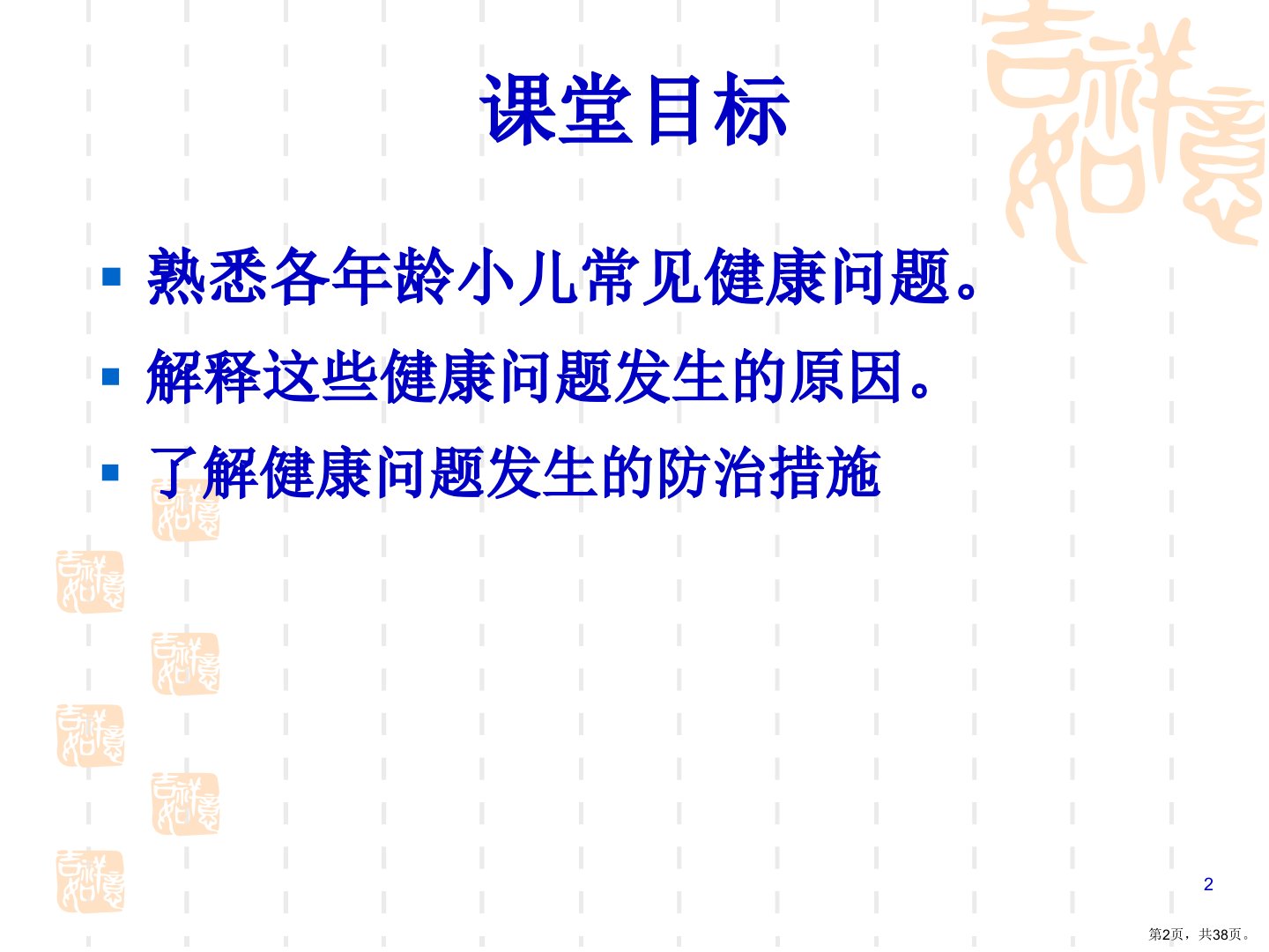 本文聚焦儿童健康问题开篇明确课堂目标包括熟悉各年龄段小儿常见健康问题、解释成因及了解防治措施。健康是身体、心理和社会上的完满状态健康问题指影响儿童健康和生长发育的问题小儿心理问题常通过行为表达。婴幼儿期常见健康问题有:屏气发作多见于618个月婴幼儿诱因多样34岁后逐渐减轻治疗需指导家长解决冲突、消除紧张情绪、避免诱发因素等;小儿擦腿综合征病因不明预防需注意会阴清洁、消除刺激因素等;小婴儿过度哭吵原因不明与婴儿气质、消化系统等有关缓解需明确无器质性疾病、调整饮食等;食物过敏1岁以内易发因肠道发育不成熟和免疫系统失衡;婴儿湿疹病因复杂与肠道系统发育不全有关处理需避免过敏食物、皮肤保湿等;婴儿猝死综合征病因不明预防需鼓励仰卧等;自闭症多在婴幼儿期发生病因未明治疗包括个体治疗等多种疗法。此外儿童意外伤害已成为014岁儿童首位死因不同年龄阶段意外伤害类型不同预防需加强教育、制定法规、完善技术等。
