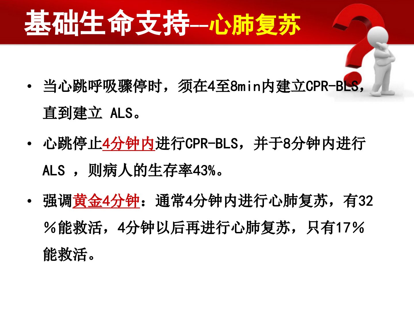儿童基础生命支持摘要:儿童心跳呼吸骤停表现为意识丧失、心音和大动脉消失、心跳呼吸停止、面色异常、瞳孔散大心电图呈一直线等。心跳呼吸骤停时4至8min内建立CPRBLS直到建立ALS黄金4分钟内进行心肺复苏存活率更高。救护对象按年龄划分为婴儿、儿童、青少年、成人急救分院内院外。2015版儿童BLS制定了健康从业人员对儿童心脏骤停的处理流程胸外按压频率每分钟至少100120次婴儿和儿童的按压幅度至少为胸部前后径的三分之一强调高质量CPR包括确保足够的胸外按压频率和深度、胸廓充分回弹、减少按压中断、避免过度通气。多名施救者时可分工同时完成多个步骤。对于持续心肺复苏且有高级气道的患者建议每6秒一次呼吸。BLS程序图强调无反应现场呼救、检查呼吸脉搏、启动应急反应系统。胸外心脏按压需准确定位平稳按压婴幼儿、幼儿、婴儿按压位置、深度和频率各有标准。人工呼吸常用口对口和口对鼻方法。心肺复苏终止指标为病人恢复自主呼吸心跳、确定死亡或复苏30分钟以上仍无反应。