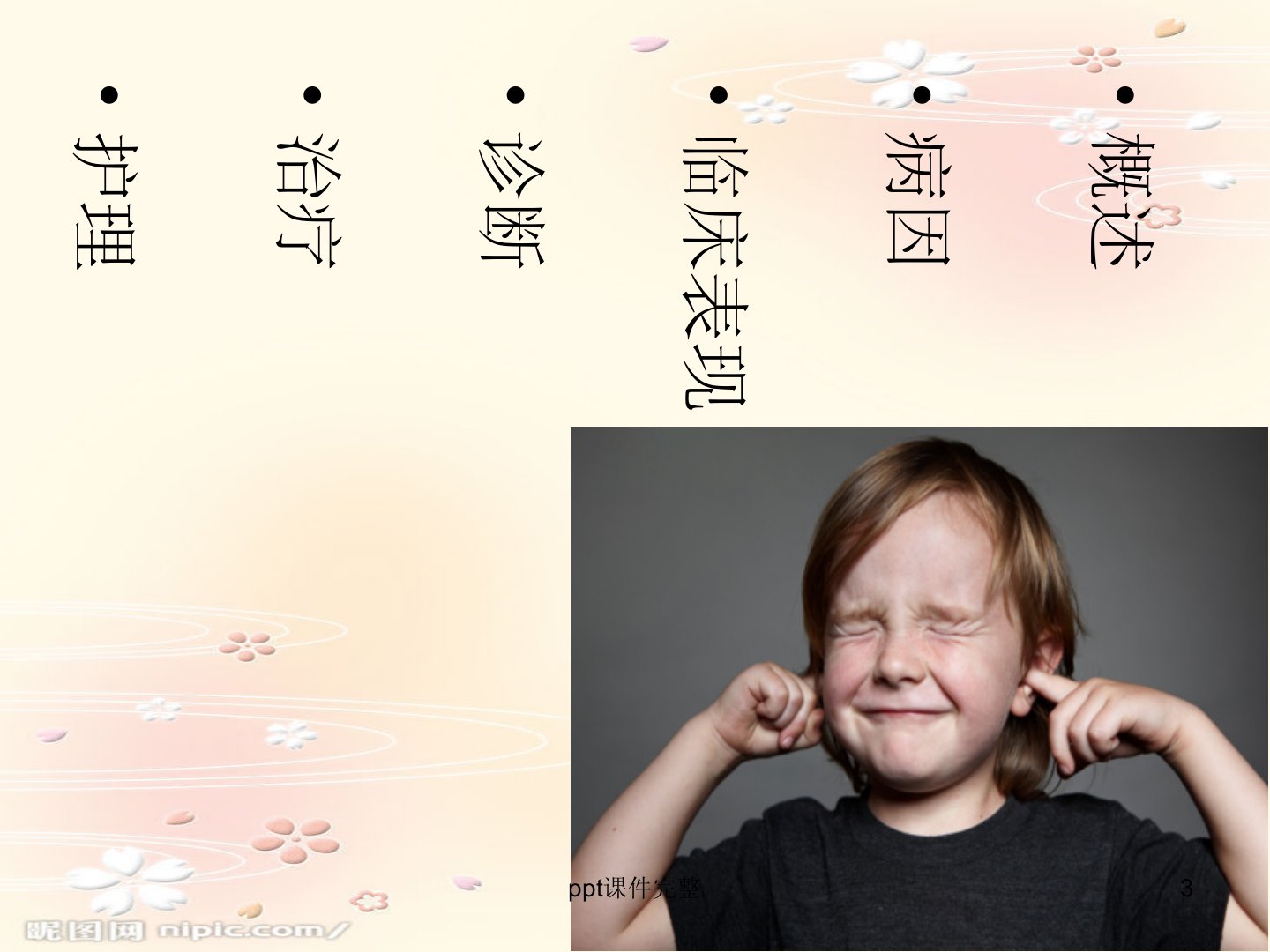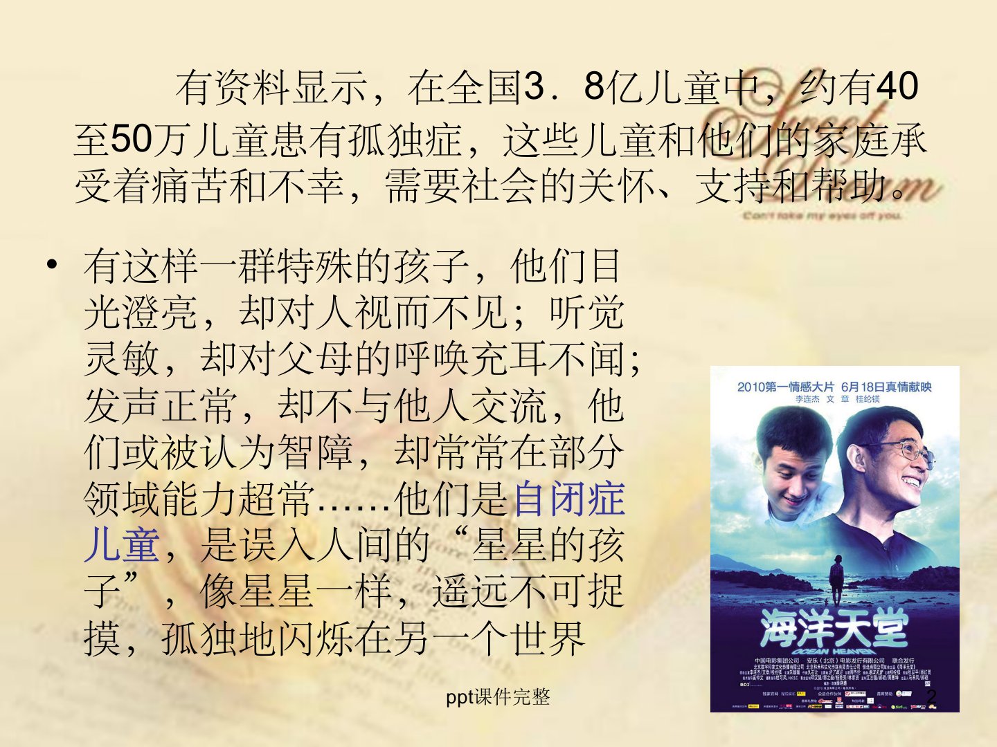 儿童孤独症14班第二大组ppt课件摘要在全国38亿儿童中约有40至50万儿童患有孤独症这些孩子被称为“星星的孩子”。儿童孤独症发生于儿童早期涉及感知觉、情感等多方面的发育障碍是一种严重的发育障碍性疾病在我国男女患病率比例为6比9。其病因包括遗传、脑器质性损害、免疫学及神经内分泌等因素。临床表现主要有社交、言语障碍兴趣狭窄、行为刻板等。诊断采用ICD10和DSMIV标准需满足社交、沟通、行为三方面异常。治疗以教育和训练为主、药物为辅心理治疗强调家庭作用与坚持性药物治疗则采用氟哌啶醇、舒必利等药物控制症状。护理方面需指导母亲与婴儿互动进行行为训练以提高社会适应能力包括训练注意、模仿动作、学习姿势性语言、提高语言交往能力及利用游戏改善交往等。纪录片《孤独的记录》讲述了双胞胎宝宝和贝贝患孤独症后父母全力投入康复训练的故事。