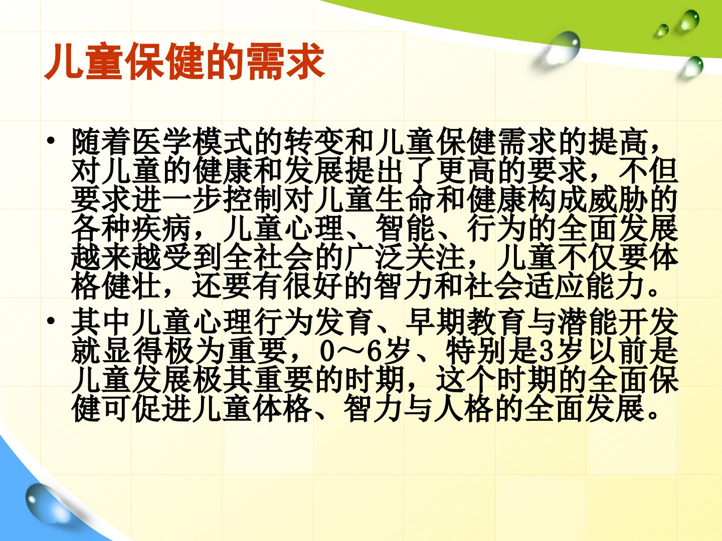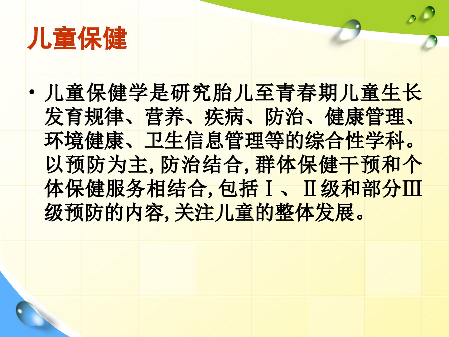 廖祥伟指出儿童保健需求随医学模式转变而提高现要求不仅控制疾病还关注儿童心理、智能、行为的全面发展。06岁特别是3岁前是儿童发展关键期全面保健可促进其体格、智力与人格的全面发展。儿童保健学是综合性学科涵盖生长发育、营养、疾病防治等内容以预防为主防治结合。儿童保健包括三级预防:疾病发生前的干预、未出现疾病症状之前的干预、彻底治疗疾病。各年龄期保健原则及重点各有不同。儿童保健门诊服务内容包括建立健康档案、新生儿访视、高危儿筛查等多项内容。儿童体格生长发育需定期监测与评价重要指标包括体重、身长、头围等。儿童神经心理行为发育包括神经系统、运动、语言、个人社会能力发育可用多种方法评价。心里和行为发育障碍指儿童期因某种因素出现的心理和行为异常常见问题包括孤独症谱系障碍、注意缺陷多动障碍等。营养性疾病预防需注意合理搭配食物常见疾病包括维生素D缺乏、缺铁性贫血等。环境污染性疾病方面儿童是铅中毒高危人群需采取预防措施。小儿合理喂养方面母乳喂养优点多添加辅食需遵循原则。