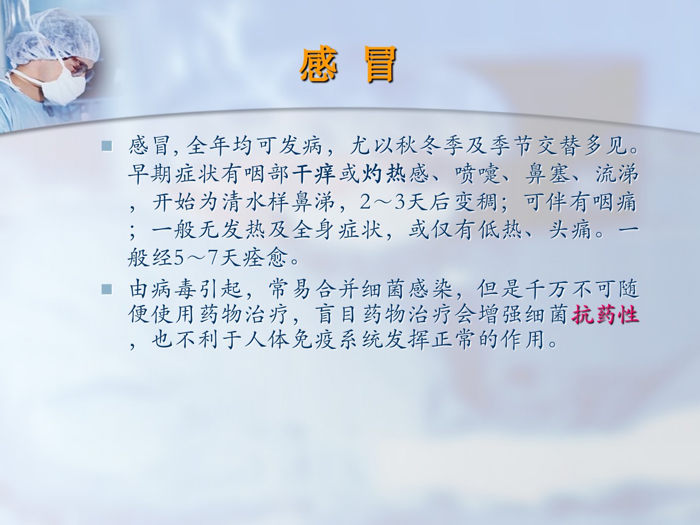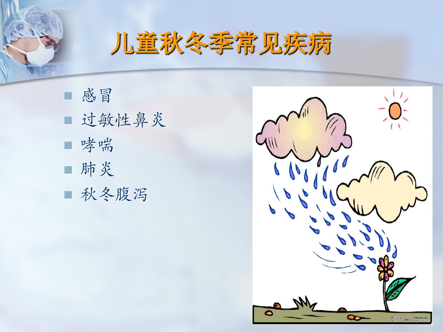 儿童保健秋冬养生摘要秋冬季儿童易患感冒、过敏性鼻炎、哮喘、肺炎、秋冬腹泻等疾病。感冒多由病毒引起早期有咽干、喷嚏等症状不可盲目用药不发热时应喝水、休息、清淡饮食发热超385或病情加重需就医感冒初期禁食生冷油腻。过敏性鼻炎秋季多发预防需先找出过敏源。哮喘与过敏体质和感冒有关预防要房间通风干燥、勤晒洗床上用品、注意运动和饮食。肺炎高发因气候干燥最初症状与感冒相似需警惕无体温肺炎。秋冬腹泻由肠道病毒引起预防要把好入口关、注意保暖和环境卫生。儿童易患呼吸系统及消化系统疾病因肺常虚、脾常不足。秋冬季养生要防燥、防凉、防寒饮食应养肺、养肾、调理脾胃注意营养平衡;起居应早睡早起(秋)早睡晚起(冬)、勤开窗通风、及时增减衣物、适当冷水锻炼、做好皮肤呵护做到“四暖一凉”。通过各种调摄保养可增强儿童体质减少疾病发生。