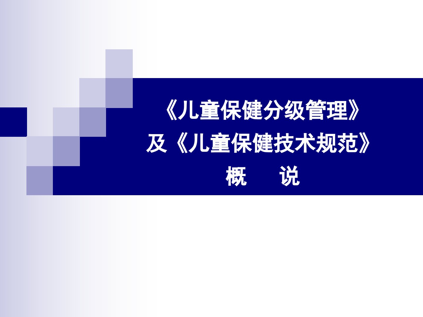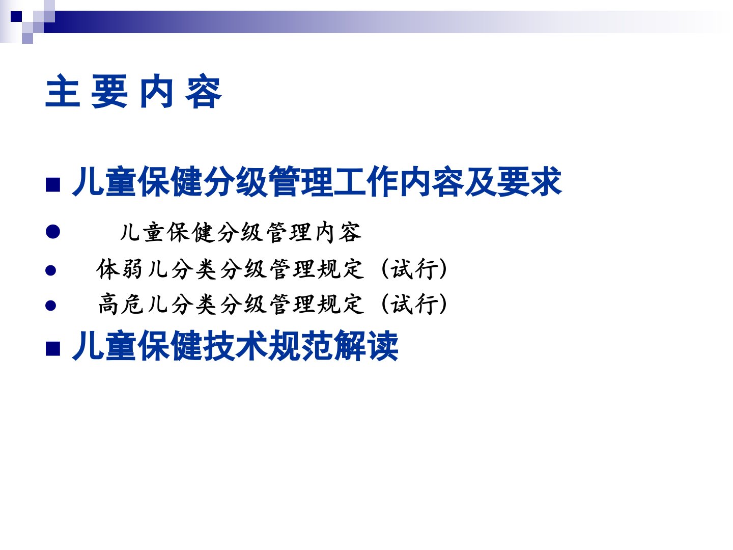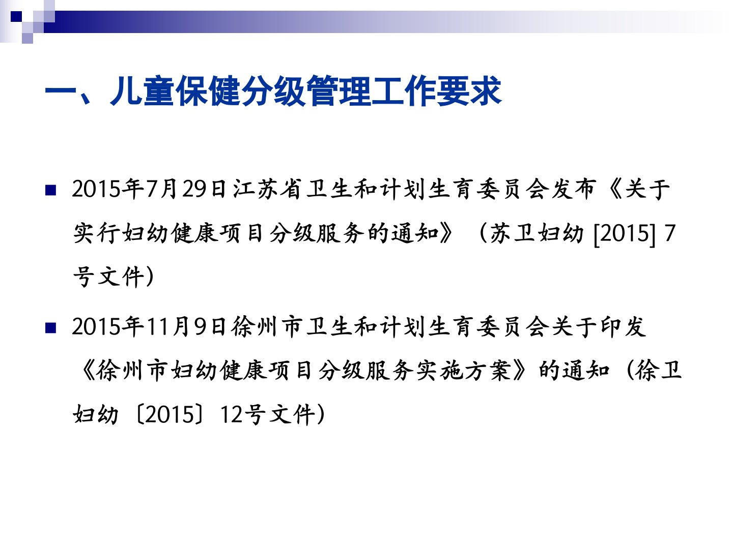 《儿童保健分级管理》及《儿童保健技术规范》概说主要内容儿童保健分级管理工作内容及要求儿童保健分级管理内容体弱儿分类分级管理规定(试行)高危儿分类分级管理规定(试行)儿童保健技术规范解读一、儿童保健分级管理工作要求2015年7月29日江苏省卫生和计划生育委员会发布《关于实行妇幼健康项目分级服务的通知》(苏卫妇幼[2015]7号文件)2015年11月9日徐州市卫生和计划生育委员会关于印发《徐州市妇幼健康项目分级服务实施方案》的通知(徐卫妇幼〔2015〕12号文件)一、儿童保健分级管理工作要求为0-6岁儿童提供的定期、系统的健康管理和健康问题处理等服务。包括新生儿家庭访视、0-6岁儿童健康检查和指导...