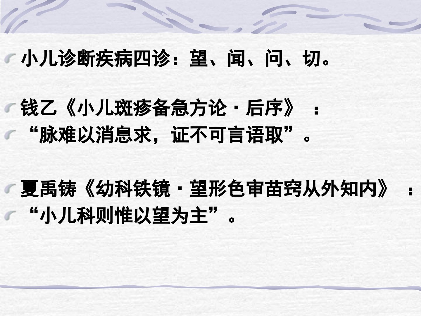 儿科诊法以四诊为核心:望、闻、问、切。望诊为重包括望神色通过观察小儿目光、神态等了解病情轻重;望形态观察病儿形体强弱胖瘦和动静姿态;审苗窍如察舌可见弄舌、吐舌等不同舌态反映不同病症察目、鼻、口、耳、二阴等判断脏腑病变;辨斑疹斑点与疹点有不同特征;望排泄物从大便、小便颜色等辨病情;察指纹正常指纹淡紫隐隐不显于风关以上病理指纹从浮沉、红紫等方面判断。闻诊通过听声音和嗅气味辅助诊断如啼哭声、呼吸声等可辨病情虚实。问诊涵盖问年龄、病情、个人史了解疾病与年龄关系及症状细节。切诊包括脉诊和按诊7岁以下儿童一指定三关7岁以上三指定寸关尺三部按诊通过触摸头囟、颈腋等部位判断病情。四诊需有序进行结合现代诊法。