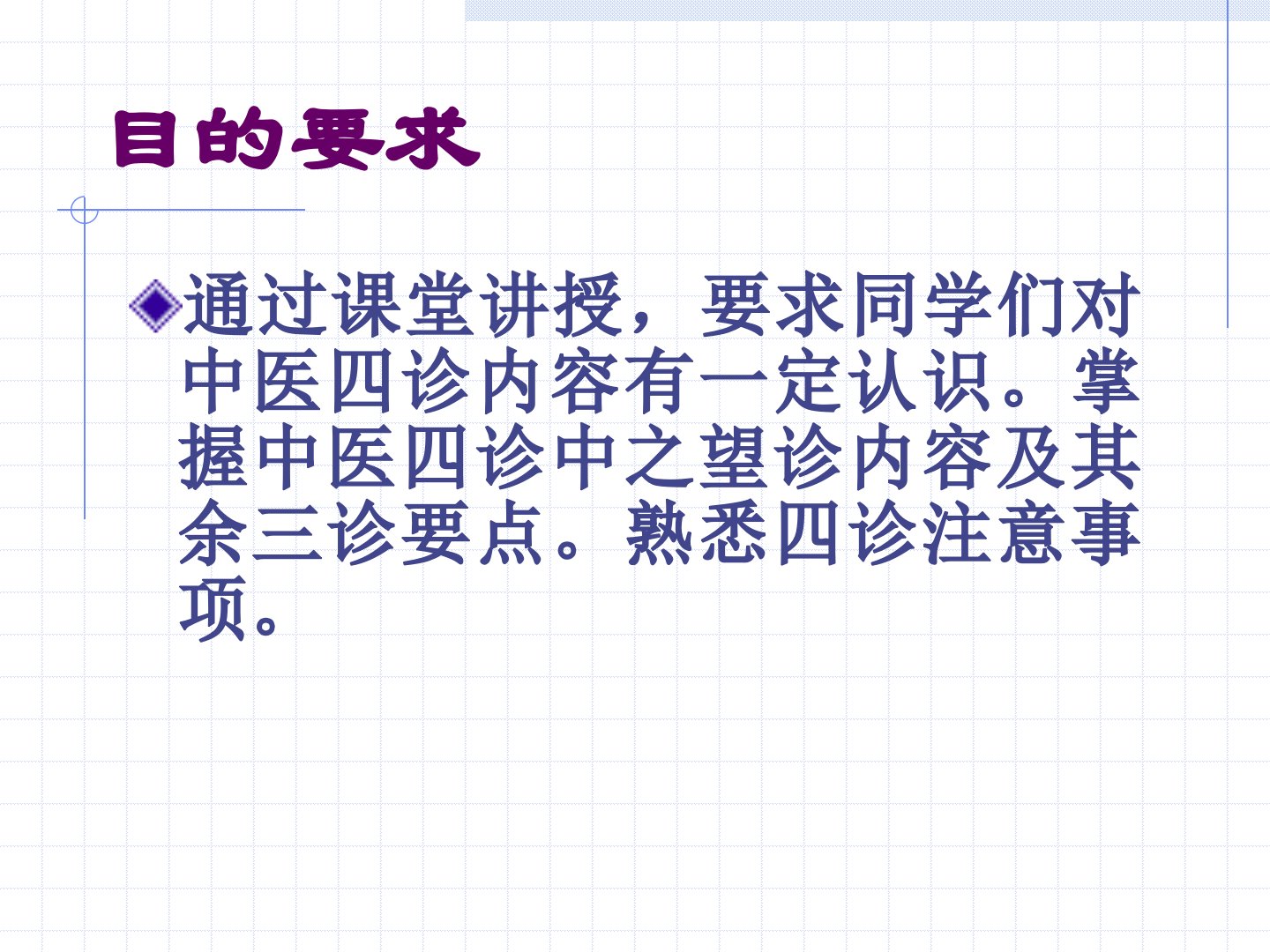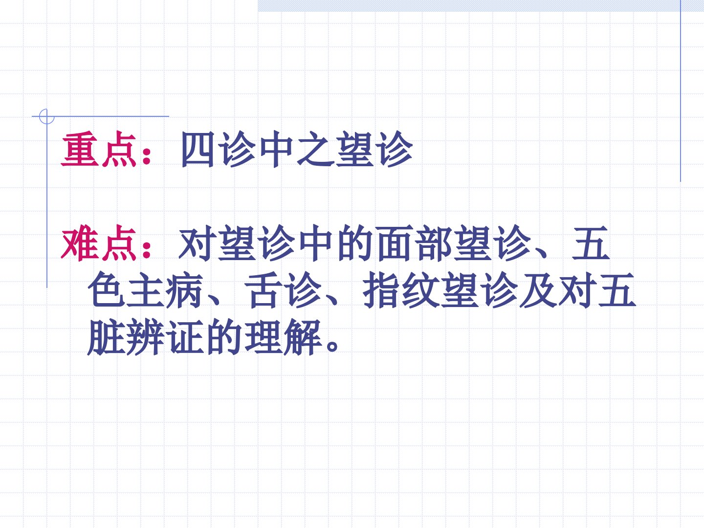 儿科诊法概要儿科教研室——许尤佳目的要求通过课堂讲授,要求同学们对中医四诊内容有一定认识。掌握中医四诊中之望诊内容及其余三诊要点。熟悉四诊注意事项。重点:四诊中之望诊难点:对望诊中的面部望诊、五色主病、舌诊、指纹望诊及对五脏辨证的理解。望诊望诊是医生运用视觉,通过对患儿全身或局部的观察,获得与疾病有关辩证资料的一种诊断方法。儿科望诊分为:总体望诊望神色,望形态分部望诊审苗窍、辨斑疹、察二便、看指纹望神色望神:观察小儿的精神状态通过对小儿目光、神态、表情、动态、语言反应等方面的综合观察,了解五脏精气盛衰和病情轻重及预后。有神无神望色:主要观察小儿的面部气色※五色主病五部配五脏望神色____五色主...