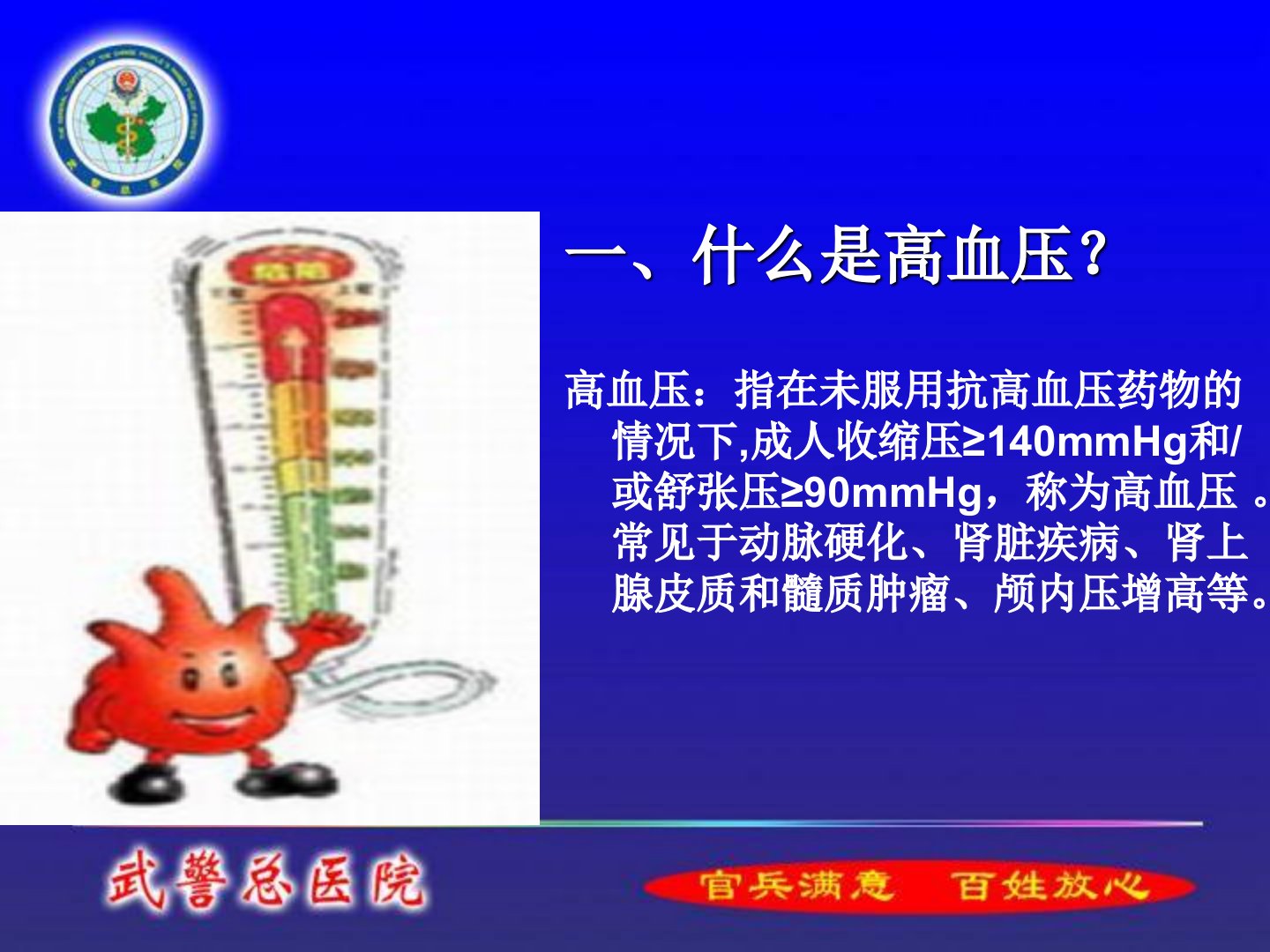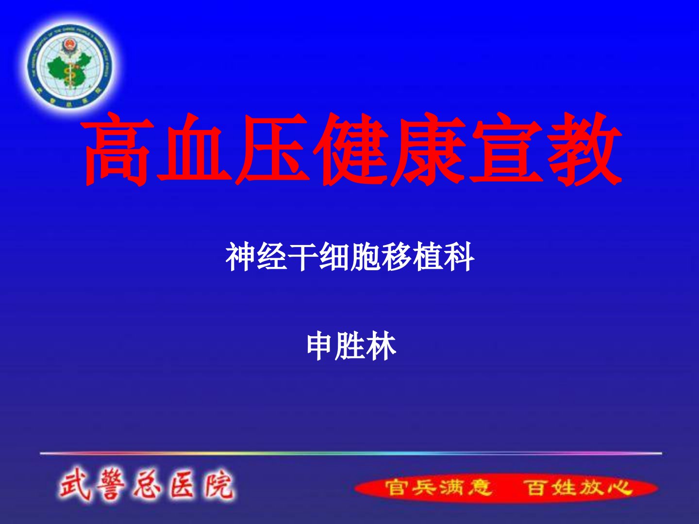 高血压健康宣教摘要本文为神经干细胞移植科申胜林医生关于高血压的健康宣教。高血压指未服抗高血压药时成人收缩压140mmHg和或舒张压90mmHg常见于动脉硬化等疾病。其病因不明但与年龄(40岁以上发病率高)、食盐摄入(多者发病率高)、体重(肥胖者发病率高)、遗传(约半数患者有家族史)、环境与职业(噪音环境、紧张脑力劳动易发城市发病率高于农村)有关。易患人群包括有家族史者、肥胖者、高盐摄取者等。患者通常需做心电图等检查确定心脏功能、眼底检查分级、尿常规检查(需用清洁容器取晨尿)、血液生化检查判断肾脏影响及危险因素、其他检查如B超及24小时动态血压监测。用药宜长期按时选温和、副作用少的药从小剂量开始。联合用药可提高疗效、减少副作用。健康教育方面运动要循序渐进饮食少盐多蔬果入院出院都要按时服药、勤测血压保持情绪稳定高血压急症时根据不同症状采取相应急救措施。
