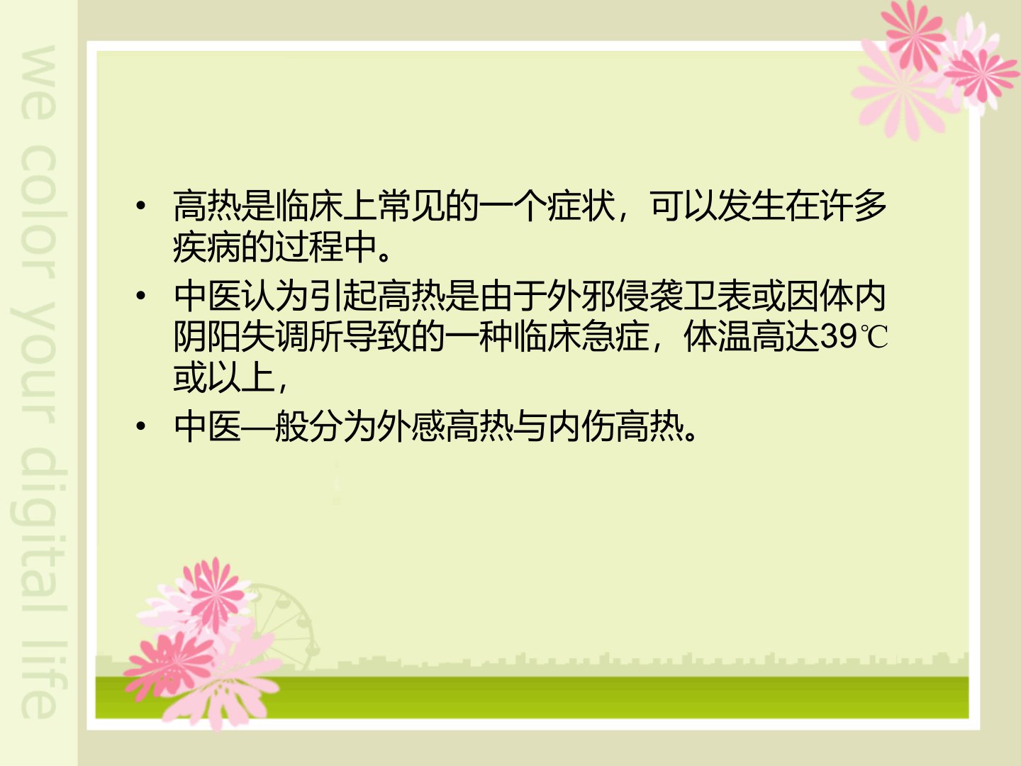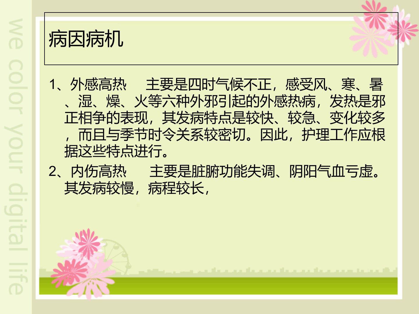 门诊张春燕指出外感高热主要由六种外邪引起发病较快较急与季节时令关系密切;内伤高热则主要是脏腑功能失调、阴阳气血亏虚发病慢、病程长。外感高热分为风寒表证、风热表证、热毒炽盛证、半表半里证;内伤高热包括热郁阳明、热入心包。护理要点包括:1一般护理如按中医内科急症护理常规进行高热期间卧床休息保持室内温度适宜等。2病情观察严密监测各项体征及时报告医生并做好抢救准备。3给药护理遵医嘱按时准确给药。4饮食护理饮食清淡易消化鼓励多饮水。5情志护理安慰患者树立信心。临床辩证施护包括针刺、物理降温、药物降温、刮痧等方法。并发症护理包括厥脱和惊厥需密切观察病情。病愈后需保持心情舒畅注意休养和保暖饮食清淡适当锻炼积极治疗原发病坚持遵医嘱治疗并定期复查。