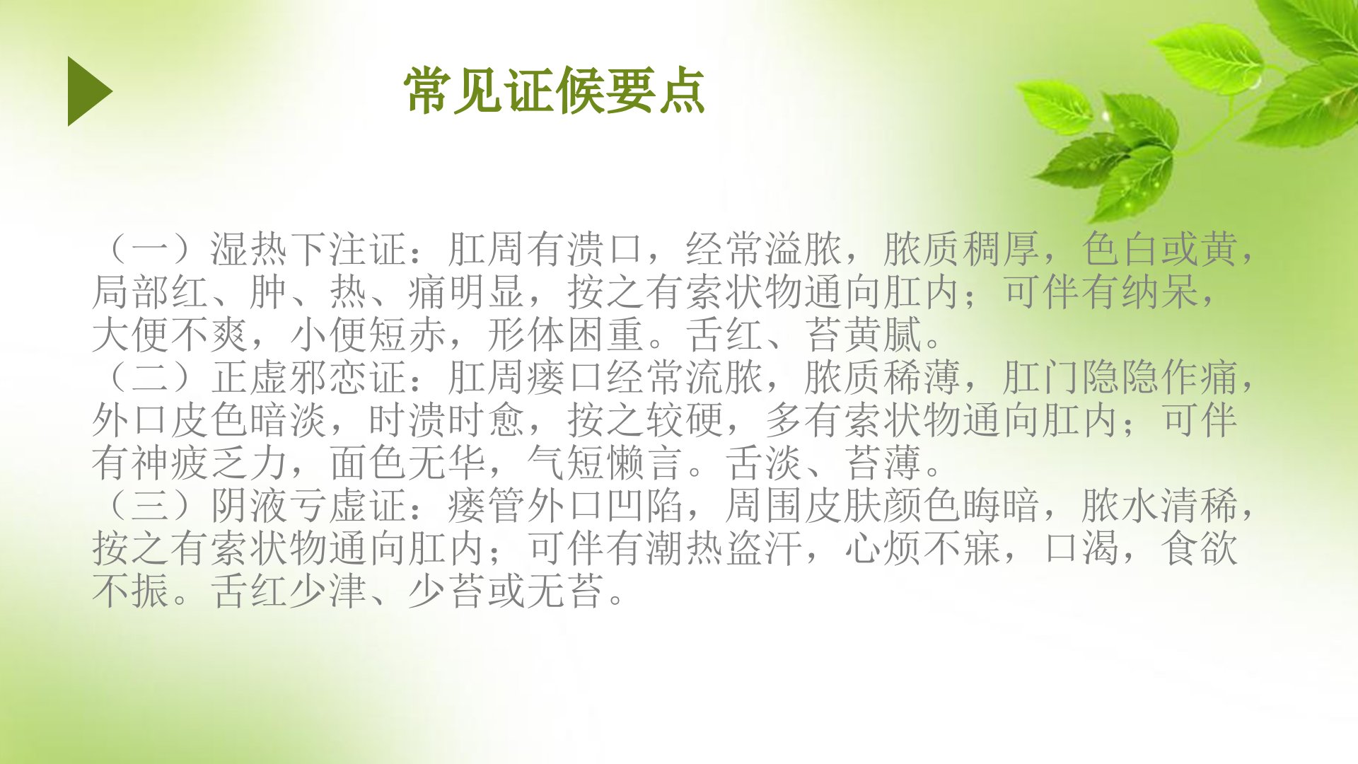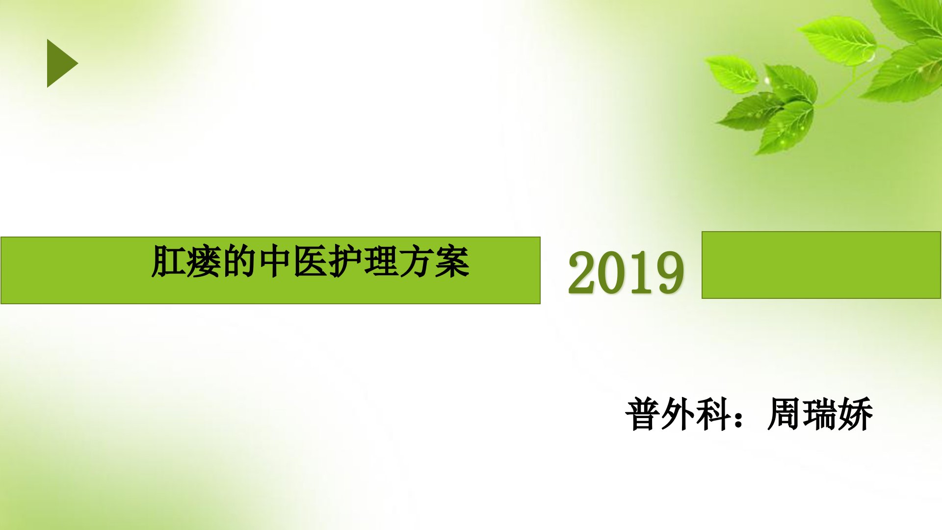 2019肛瘘的中医护理方案摘要本文是普外科周瑞娇医生关于2019年肛瘘的中医护理方案涵盖常见证候、症状施护、中医特色治疗及健康指导。常见证候包括湿热下注证、正虚邪恋证、阴液亏虚证各有不同症状表现。症状施护方面针对肛周溃口流脓需观察脓液情况保持肛周清洁干燥遵医嘱中药熏洗、外敷及穴位按摩;针对肛周疼痛需观察疼痛情况协助患者变换体位遵医嘱穴位贴敷、按摩、中药熏洗及物理治疗。中医特色治疗护理包括内服、注射、外用中药以及中药熏洗、穴位贴敷、按摩、外敷等特色技术同时介绍了围手术期的中医护理方法。健康指导强调生活起居、饮食和情志调理如保持肛周清洁干燥勿负重远行饮食宜清淡根据证型选择相应食疗方多与患者沟通鼓励家属陪伴。最后还介绍了护理效果评价和护理依从性及满意度评价内容。