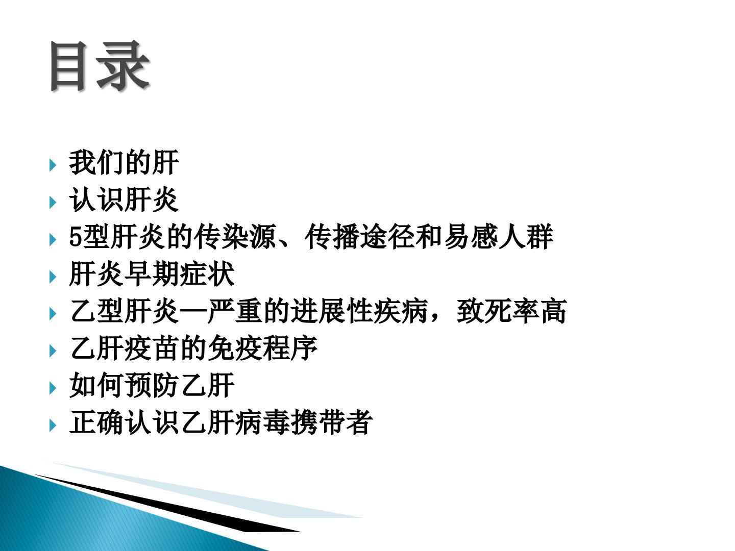 肝炎健康宣教摘要肝脏是人体重要器官肝炎是肝脏炎症病因多样最常见的是病毒还有自身免疫、酗酒等因素。病毒性肝炎分5型各有传染源、传播途径和易感人群。肝炎早期症状多样如食欲减退、面色黯黑、巩膜或皮肤黄染、肝区隐痛等。甲肝和戊肝主要经粪口途径传播养成良好卫生习惯可预防。乙肝传播途径包括母婴传播、医源性传播、性接触传播等传染性很强。乙肝疫苗全程接种3针按0、1、6个月程序延后应尽快补种。预防乙肝接种疫苗最有效还要避免不必要的注射等。丙肝传染源是HCV感染者传播途径多样高危人群包括受血者、静脉吸毒者等。丙肝治疗目标是抑制或清除病毒抗病毒治疗药物有IFN、PEGIFN等最佳方案是PEGIFN联合RBV。丁肝传播途径与乙肝相似只能感染乙肝阳性患者。预防肝炎要注意卫生、避免不必要的医疗操作、健康饮食、锻炼身体等。正确认识肝炎要树立信心采取正确治疗措施社会不应歧视患者。