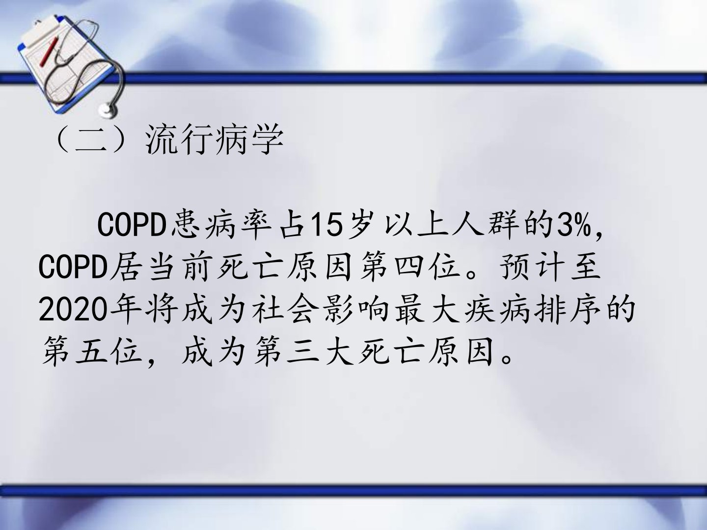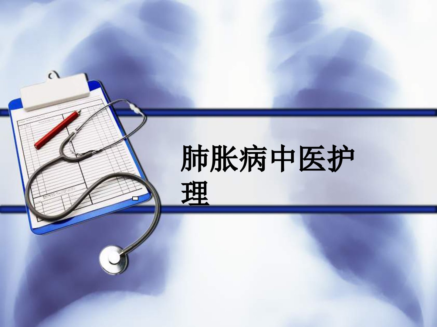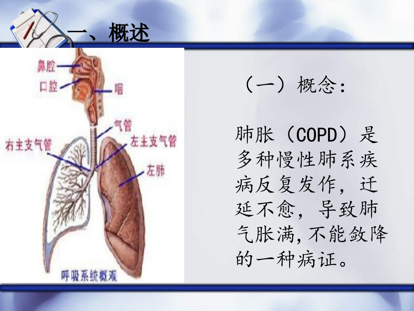 肺胀病中医护理一、概述(一)概念:肺胀(COPD)是多种慢性肺系疾病反复发作,迁延不愈,导致肺气胀满,不能敛降的一种病证。(二)流行病学COPD患病率占15岁以上人群的3%,COPD居当前死亡原因第四位。预计至2020年将成为社会影响最大疾病排序的第五位,成为第三大死亡原因。(三)临床表现:以喘息气短,咳嗽咯痰,胸闷胀满或唇甲紫绀、心悸、浮肿为主要临床表现。(四)辩证分型肺脾气虚型肺肾气虚型肺肾气阴两虚型(五)治疗COPD的药物治疗目的:1、改善气流2、恢复其可逆部分3、预防和控制症状4、阻止症状发展和疾病加重5、保持适当的肺功能6、提高运动耐力和生活质量(理想的治疗模式是多个环节、综合控制)...