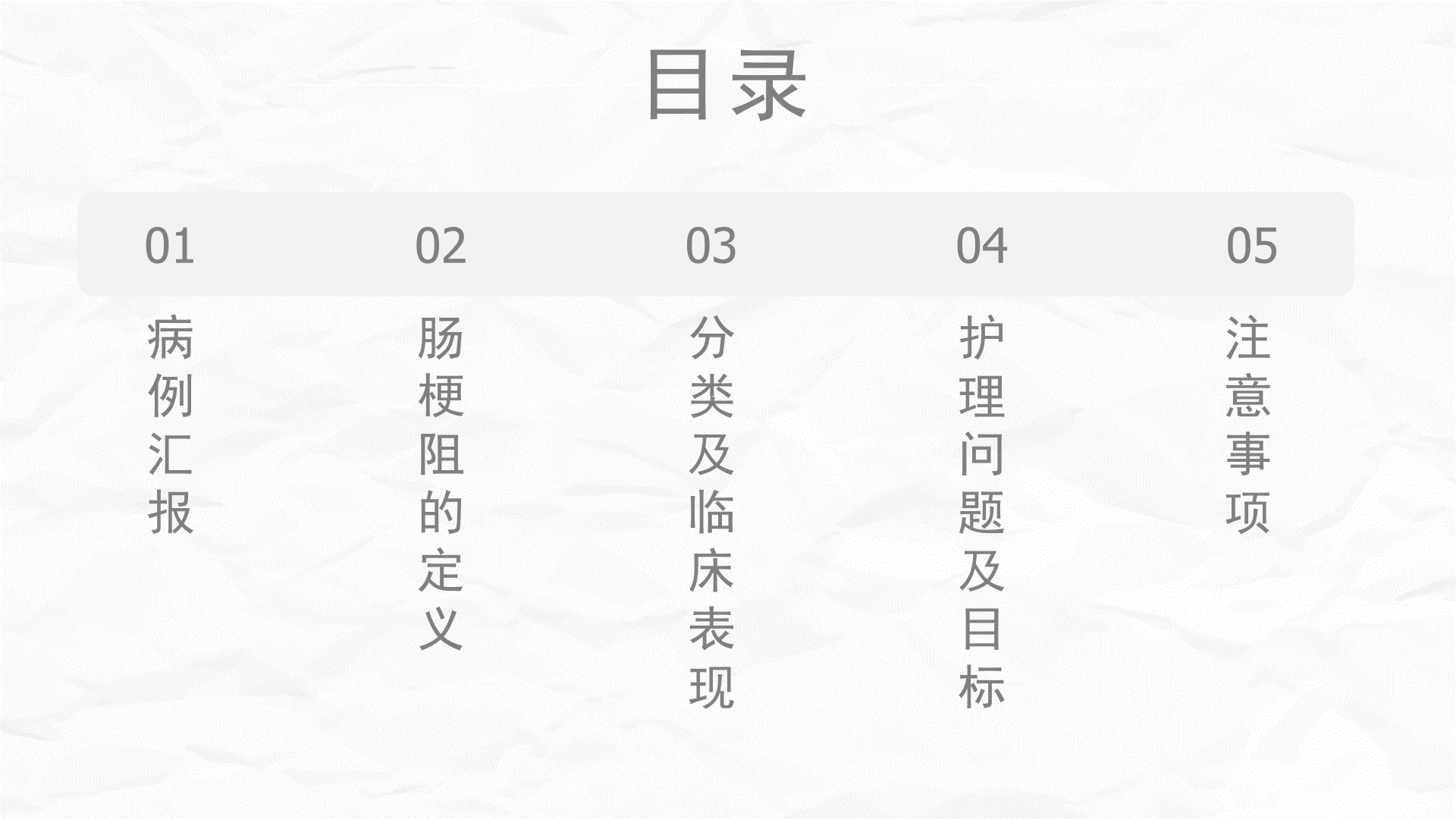 肠梗阻护理查房摘要本次查房围绕一例肠梗阻患者展开。患者xx男因“腹胀、呕吐、腹痛、停止排便排气”入院查体与实验室检查确诊肠梗阻伴有电解质紊乱等情况入院后给予二级护理、禁食水等措施。护理要点上一是维持体液平衡合理输液并记录出入量同时给予胃肠外营养梗阻解除后调整饮食;二是有效缓解疼痛通过禁食、胃肠减压清除肠腔内积气积液期间保持负压吸引通畅密切观察引流液;对不完全性等肠梗阻可腹部按摩、针灸明确诊断后适当应用解痉剂。肠梗阻是常见急腹症按原因、程度、部位、发病缓急分类。临床表现有腹痛、呕吐、腹胀、停止排气排便等。护理问题涉及体液不足、疼痛、舒适改变等方面目标是维持体液平衡、缓解疼痛等。出院后患者需注意饮食加强自我监测预防肠梗阻。