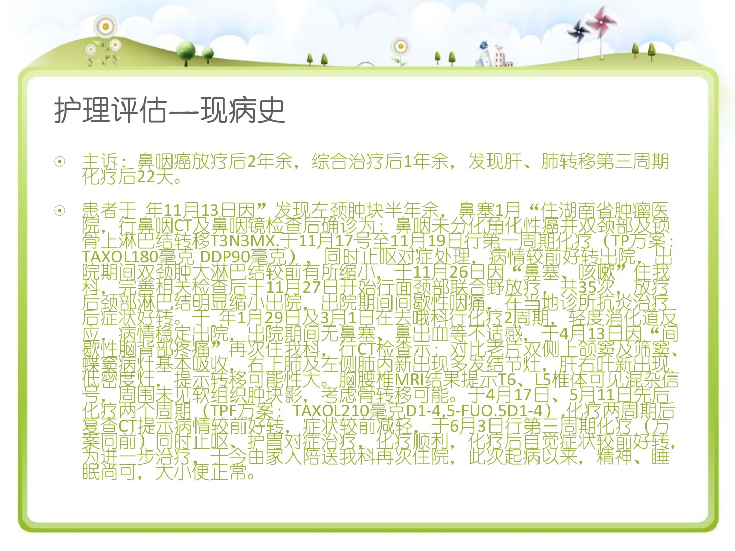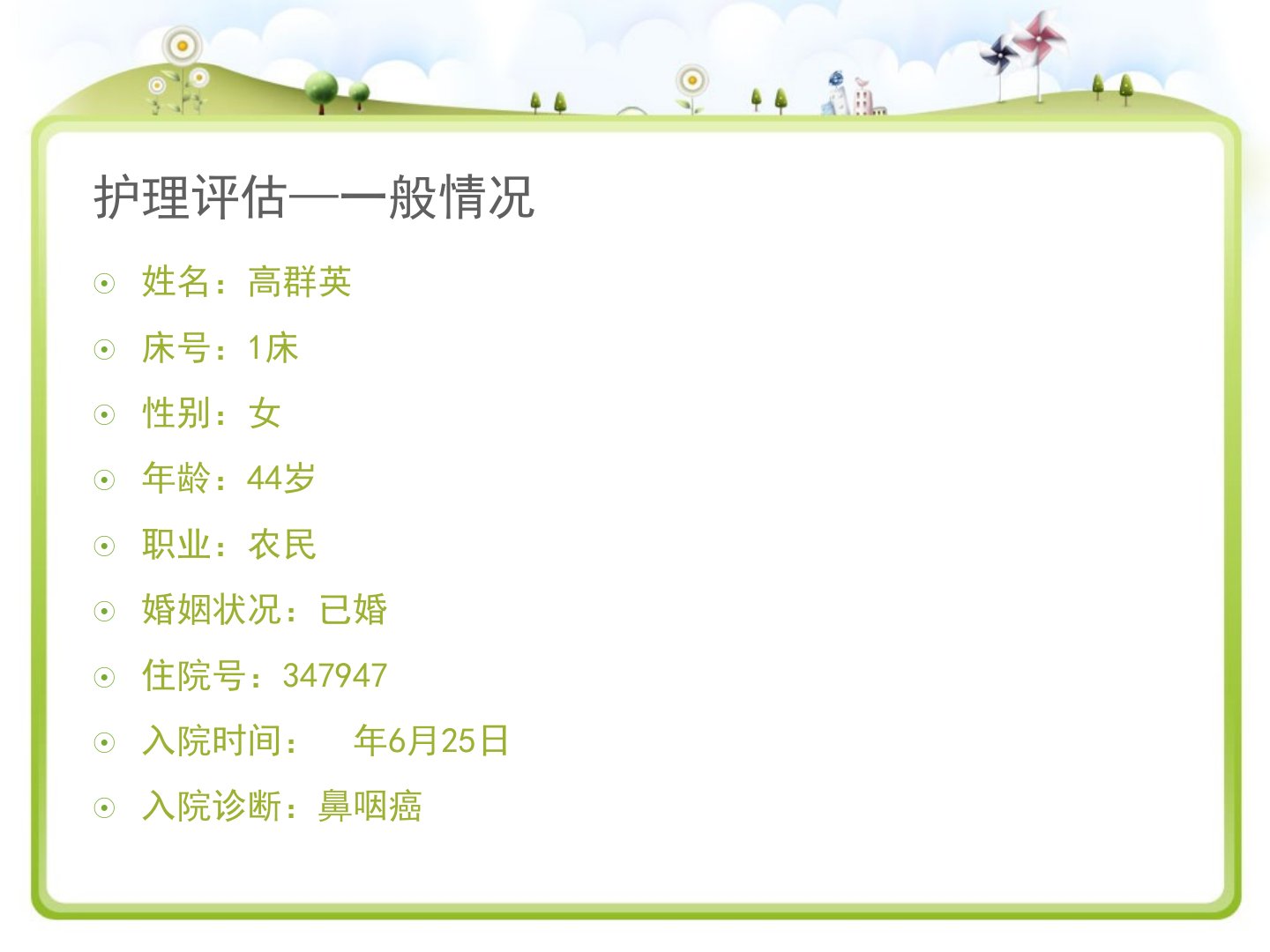 本文对44岁鼻咽癌女患者高群英进行护理评估与措施总结。患者农民已婚因鼻咽未分化角化性癌入院现处于鼻咽癌放疗后2年余、综合治疗后1年余发现肝肺转移、第三周期化疗后22天的阶段。护理评估涵盖一般情况、现病史、护理体检、自理程度与生活习惯、辅助检查等方面患者现精神、睡眠尚可大小便正常发育正常营养中等神志清楚全身皮肤及巩膜无异常双侧颈部皮肤呈放疗后改变未扣及明显肿大淋巴结除白细胞略低外其他血检结果正常。护理诊断包括化疗药物外渗危险、营养失调、自我形象紊乱、焦虑、疼痛、活动无耐力等问题。护理措施针对诊断问题展开如建议置PICC管防化疗药物外渗、提供可口高营养食物改善营养、加强心理疏导助患者接受形象改变、介绍环境与化疗注意事项减轻焦虑等。最后文章还提及了健康指导相关内容。