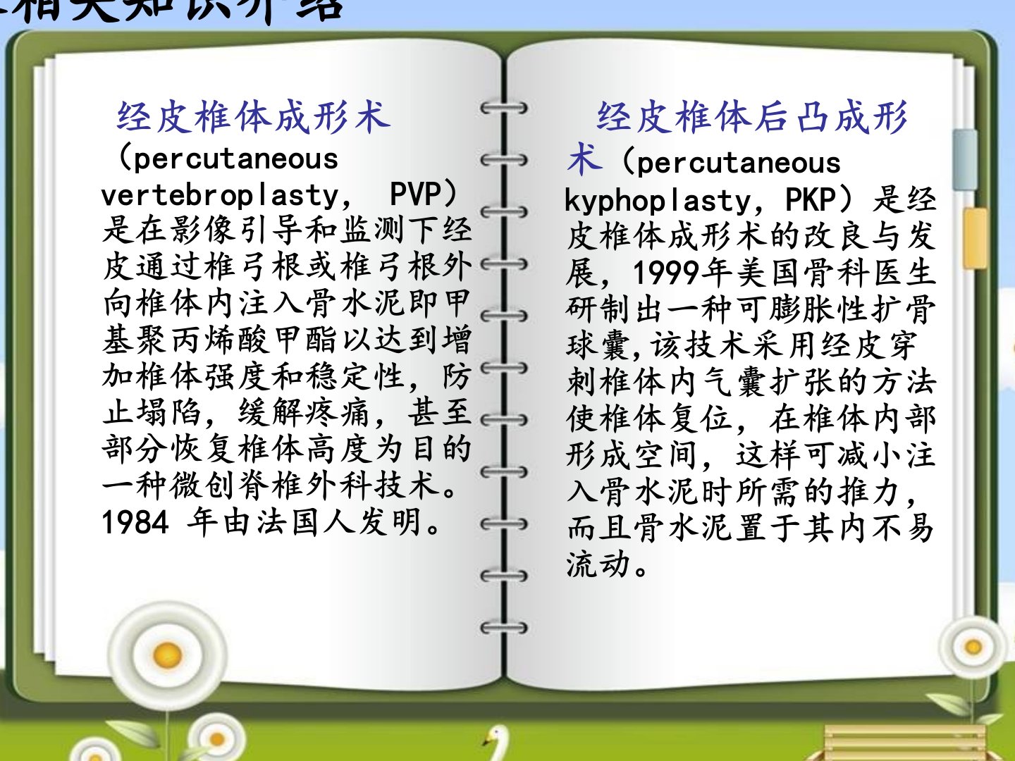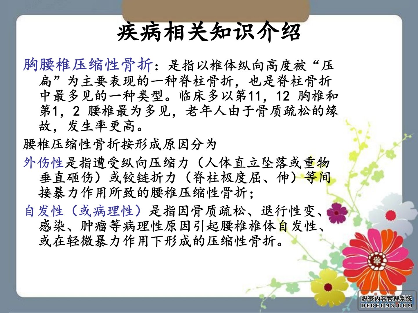腰椎骨折PKP术后的护理骨二科火梅疾病相关知识介绍胸腰椎压缩性骨折:是指以椎体纵向高度被“压扁”为主要表现的一种脊柱骨折,也是脊柱骨折中最多见的一种类型。临床多以第11,12胸椎和第1,2腰椎最为多见,老年人由于骨质疏松的缘故,发生率更高。腰椎压缩性骨折按形成原因分为外伤性是指遭受纵向压缩力(人体直立坠落或重物垂直砸伤)或铰链折力(脊柱极度屈、伸)等间接暴力作用所致的腰椎压缩性骨折;自发性(或病理性)是指因骨质疏松、退行性变、感染、肿瘤等病理性原因引起腰椎椎体自发性、或在轻微暴力作用下形成的压缩性骨折。手术相关知识介绍经皮椎体成形术(percutaneousvertebroplasty,PVP...