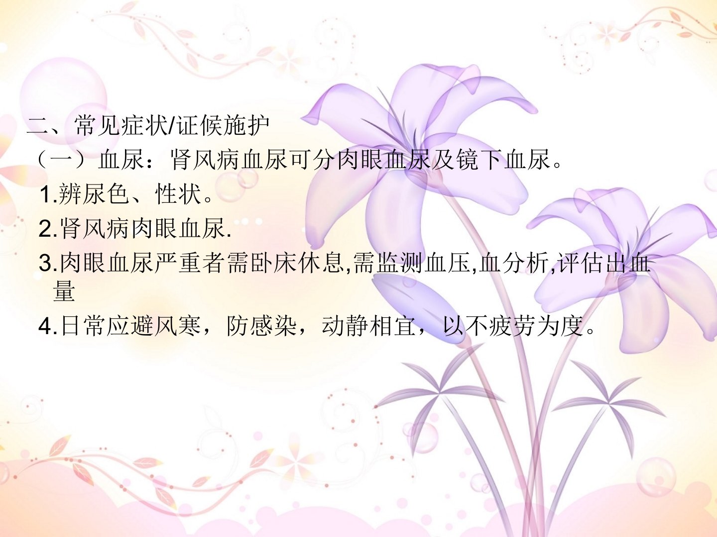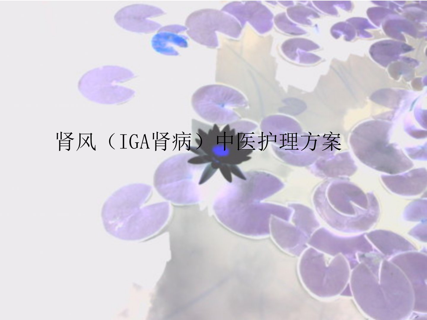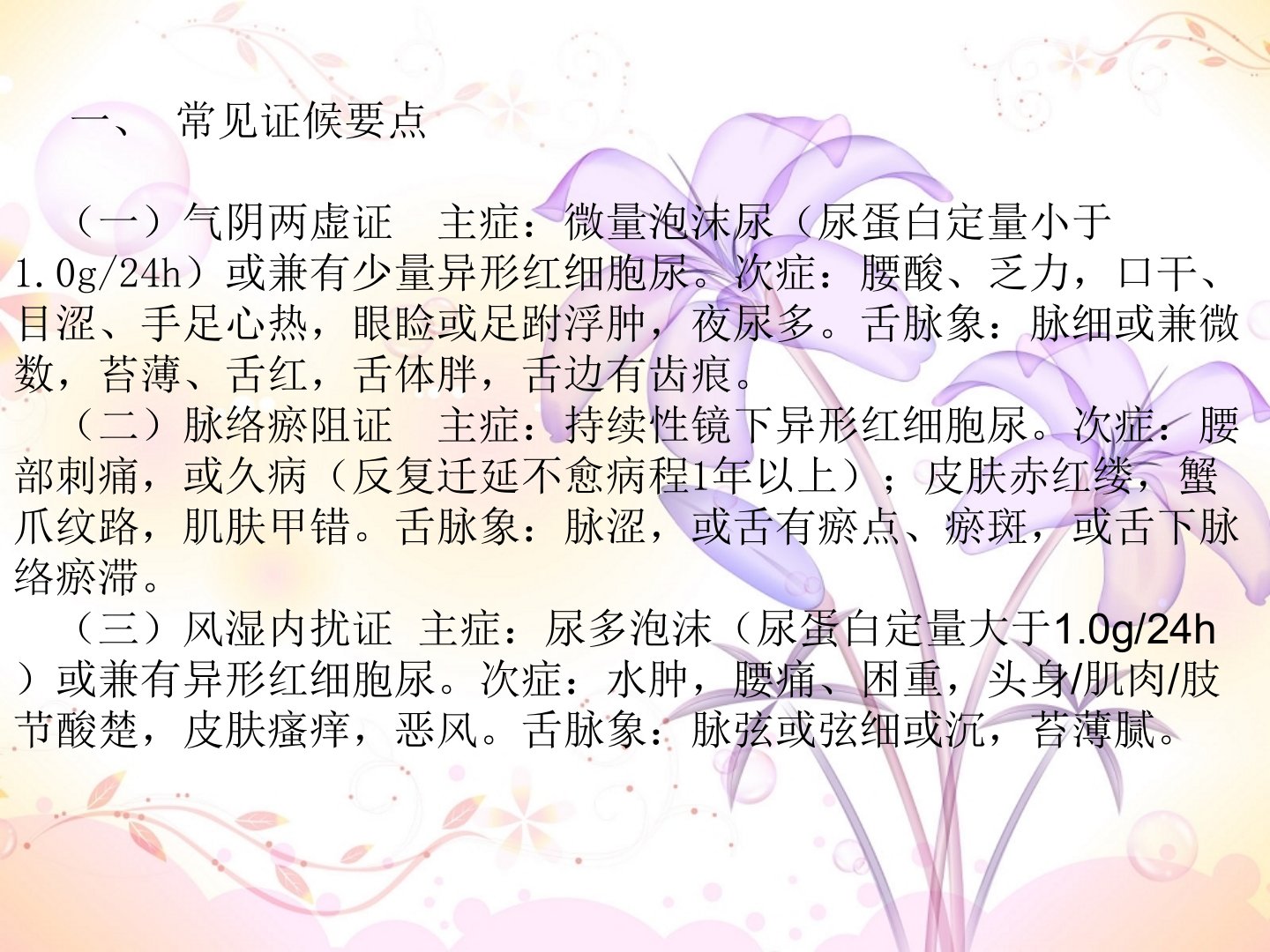 肾风(IGA肾病)中医护理方案摘要常见证候要点1气阴两虚证:微量泡沫尿或少量异形红细胞尿伴腰酸、乏力等症状脉细苔薄舌红。2脉络瘀阻证:持续性镜下异形红细胞尿伴腰部刺痛等症状脉涩或舌有瘀点。3风湿内扰证:尿多泡沫或兼有异形红细胞尿伴水肿、腰痛等症状脉弦苔薄腻。常见症状证候施护1血尿:辨尿色性状严重者卧床监测血压避风寒防感染。2泡沫尿:检测尿常规观察影响因素注意优质蛋白摄入。3水肿:评估水肿程度保持皮肤清洁监测血压尿量。4头晕血压增高:及时报告医师避免不良刺激饮食清淡。5尿量异常:关注生命体征做好用药护理多尿夜尿注意休息。6腰痛腰酸:采用耳穴贴压、艾条温和灸。中医特色治疗护理包括内服中药、中药外敷等。健康指导1生活起居:保持环境静谧适当运动进行中医自我保健。2饮食指导:根据证型选择食物宜优质低蛋白饮食。3情志调理:顺情从欲、说理开导、自我放松、分心移情。护理效果评价表需及时、真实、可靠填写。