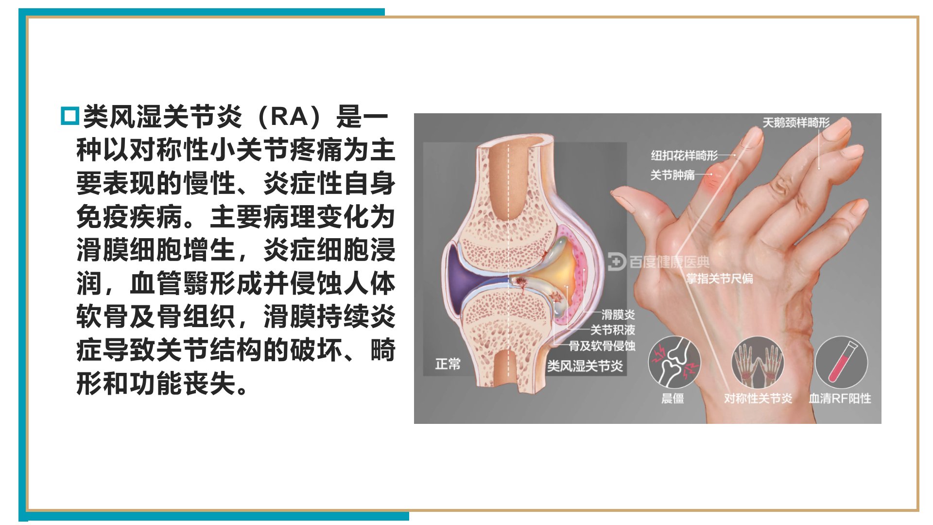 类风湿关节炎类风湿关节炎(RA)是一种以对称性小关节疼痛为主要表现的慢性、炎症性自身免疫疾病。主要病理变化为滑膜细胞增生,炎症细胞浸润,血管翳形成并侵蚀人体软骨及骨组织,滑膜持续炎症导致关节结构的破坏、畸形和功能丧失。本病多见于女性,流行病学调查显示,类风湿关节炎的全球发病率为0.5%~1%,中国大陆地区发病率为0.42%,总患病人数约500万,男女患病比率约为l∶4。本病属于中医学“尪痹”范畴。一、病因病机本病的发生与体质、气候、生活环境等有密切关系。正虚卫外不固是发病的内在基础,感受外邪是发病的外在条件,风、寒、湿、热、痰、瘀等邪气痹阻肢体经脉为病机根本。其病位在肝、肾、骨、关节、筋脉、肌...