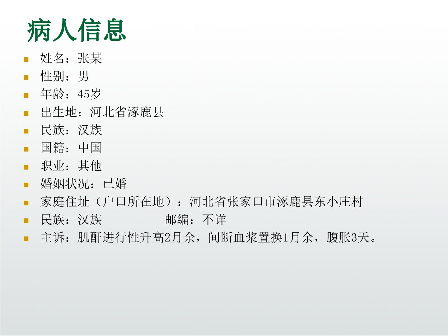 肾病综合症护理查房摘要本次查房聚焦肾病综合症患者张某的护理患者45岁河北省涿鹿县人。主诉为肌酐进行性升高2月余、间断血浆置换1月余、腹胀3天。2月前患者因血尿、尿中泡沫增多就诊诊断为“肾病综合征”治疗后肌酐升高后确诊为急性肾小球肾炎(I型)、新月体性肾炎、Goodpasture综合征经激素冲击、血浆置换等治疗后好转出院3天前因腹胀等再次入院。患者有高血压、高血脂、脂肪肝病史无其他疾病史。初步诊断为急性肾小球肾炎(I型)等。主要治疗包括激素、利尿、纠正电解质失衡、控制血压、调节血脂、改善贫血、抗凝、保胃等。主要护理措施有I级护理、限制探视、观察水肿等。护理问题包括体液过多、感染危险、出血危险、皮肤受损危险及焦虑。护理需针对各问题采取措施如体液过多时需绝对卧床、预防压疮;预防感染要清洁环境、指导患者卫生习惯;有出血危险需观察凝血功能;皮肤受损则注重护理与观察;对于焦虑患者需加强沟通给予关爱。