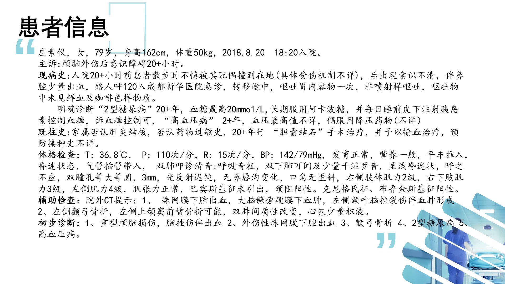 神经外科护理查房摘要汇报人汇报了79岁女性患者庄素仪的护理情况。患者因散步时被配偶撞倒出现意识障碍20小时后入院主诉为颅脑外伤后意识障碍有20年2型糖尿病、2年高血压病史曾行“胆囊结石”手术治疗。体格检查显示患者昏迷、气管插管双下肺有少量干湿罗音右侧肢体肌力较弱。辅助检查发现蛛网膜下腔出血、硬膜下血肿等多种病症。初步诊断为重型颅脑损伤、外伤性蛛网膜下腔出血、颧弓骨折、2型糖尿病、高血压病。治疗过程采用保守治疗包括神经外科护理常规、特级护理、完善多项检查、持续心电监护及血氧饱和度监测、有创呼吸机辅助通气以及止血、降颅内压、营养神经等对症支持治疗。目前患者呈昏睡状生命体征稳定已转出重症监护室到普通病房。护理诊断问题包括疼痛、意识障碍、皮肤受损危险、清理呼吸道无效及潜在并发症并提出了相应的护理措施。