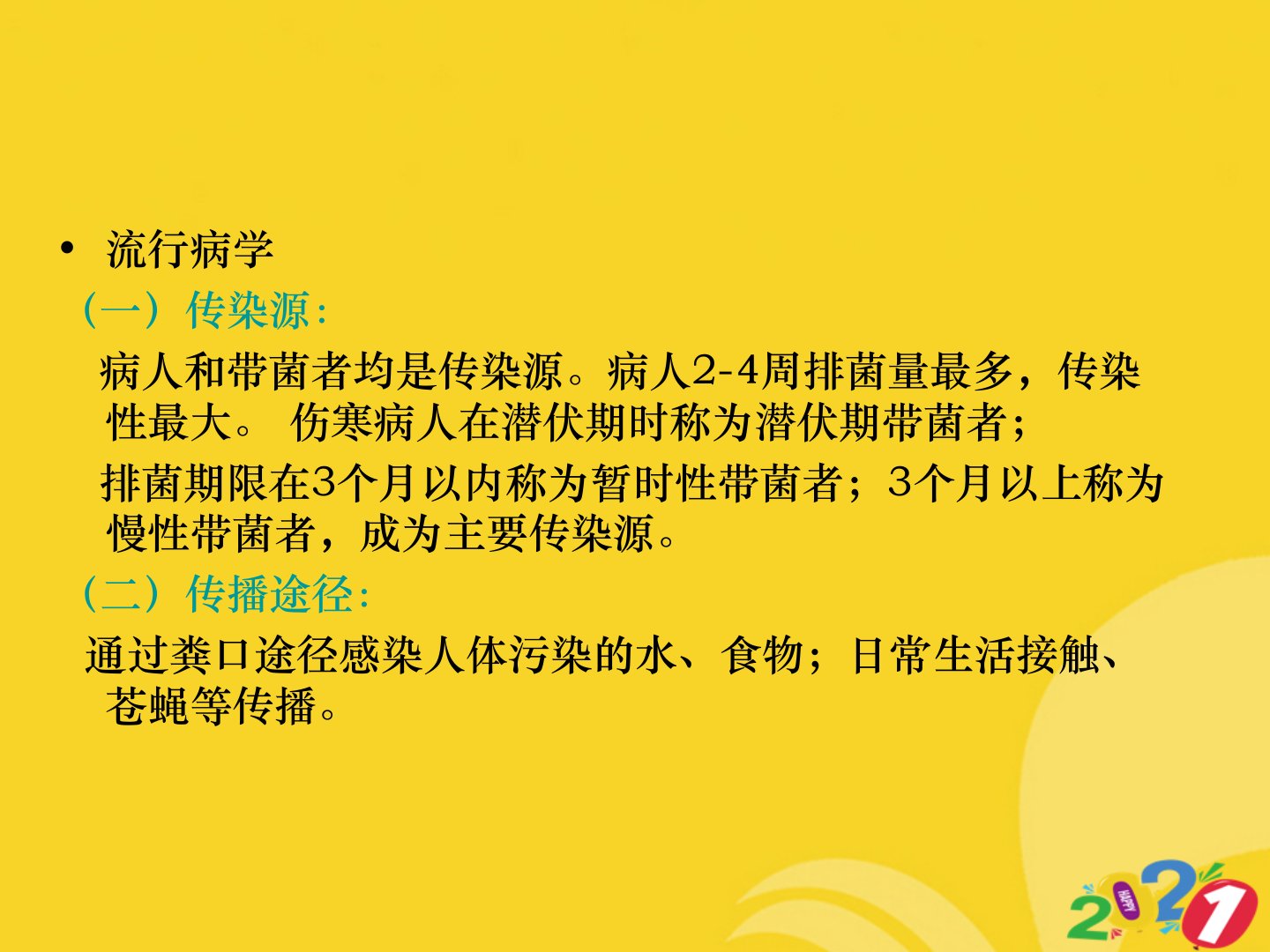伤寒由伤寒杆菌引起属急性肠道传染病临床特征包括持续发热、表情淡漠、相对缓脉、玫瑰疹、肝脾肿大与白细胞减少等严重并发症为肠出血、肠穿孔是我国法定的乙类传染病。传染源为病人和带菌者通过粪口途径传播人普遍易感病后免疫力持久。本病终年可见夏秋季节多儿童及青少年多见。临床表现分为四期:初期、极期、缓解期、恢复期极期常出现肠出血、肠穿孔等并发症。辅助检查诊断包括流行病学资料、临床表现及实验室检查血培养是确诊方法。治疗包括一般治疗、病原治疗、慢性带菌者的治疗及并发症治疗。护理方面需关注体温过高、营养失调及潜在并发症采取一般护理、病情观察、对症护理、用药护理、并发症护理及心理护理等措施。