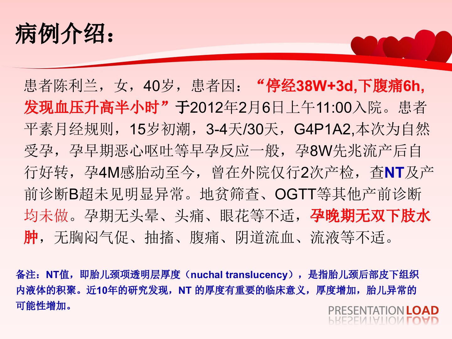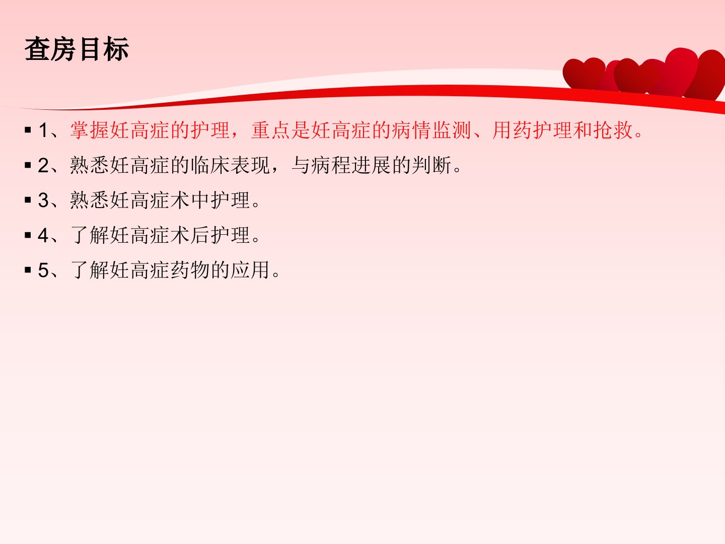 妊高症护理查房摘要本次查房目标为掌握妊高症护理重点包括病情监测、用药护理和抢救熟悉临床表现、病程进展判断、术中护理了解术后护理及药物应用。病例中患者陈利兰40岁G4P1A2因停经38W3d、下腹痛6h、血压升高半小时入院。既往有“乙肝大三阳”无其他传染病。查体BP190103mmHg辅助检查示尿蛋白等异常诊断为孕4产1宫内妊娠38W3d、重度子痫前期。护理诊断有潜在并发症胎儿窘迫、药物不良反应、受伤危险等。针对胎儿窘迫嘱患者卧床左侧卧位做30min胎监监测血压等症状限制盐摄入;药物护理方面硫酸镁用药前备解毒剂监测相关指标严格掌握用量及速度;对于受伤危险保持病室安静备好急救物品做好心理护理。2月16日患者行剖宫产术术程顺利。术中护理诊断有潜在并发症出血性休克、新生儿窒息危险等并采取相应护理措施。术后转爱婴区护理诊断为潜在并发症出血性休克、感染危险产后需常规护理监测生命体征防止产后子痫观察子宫复旧情况。