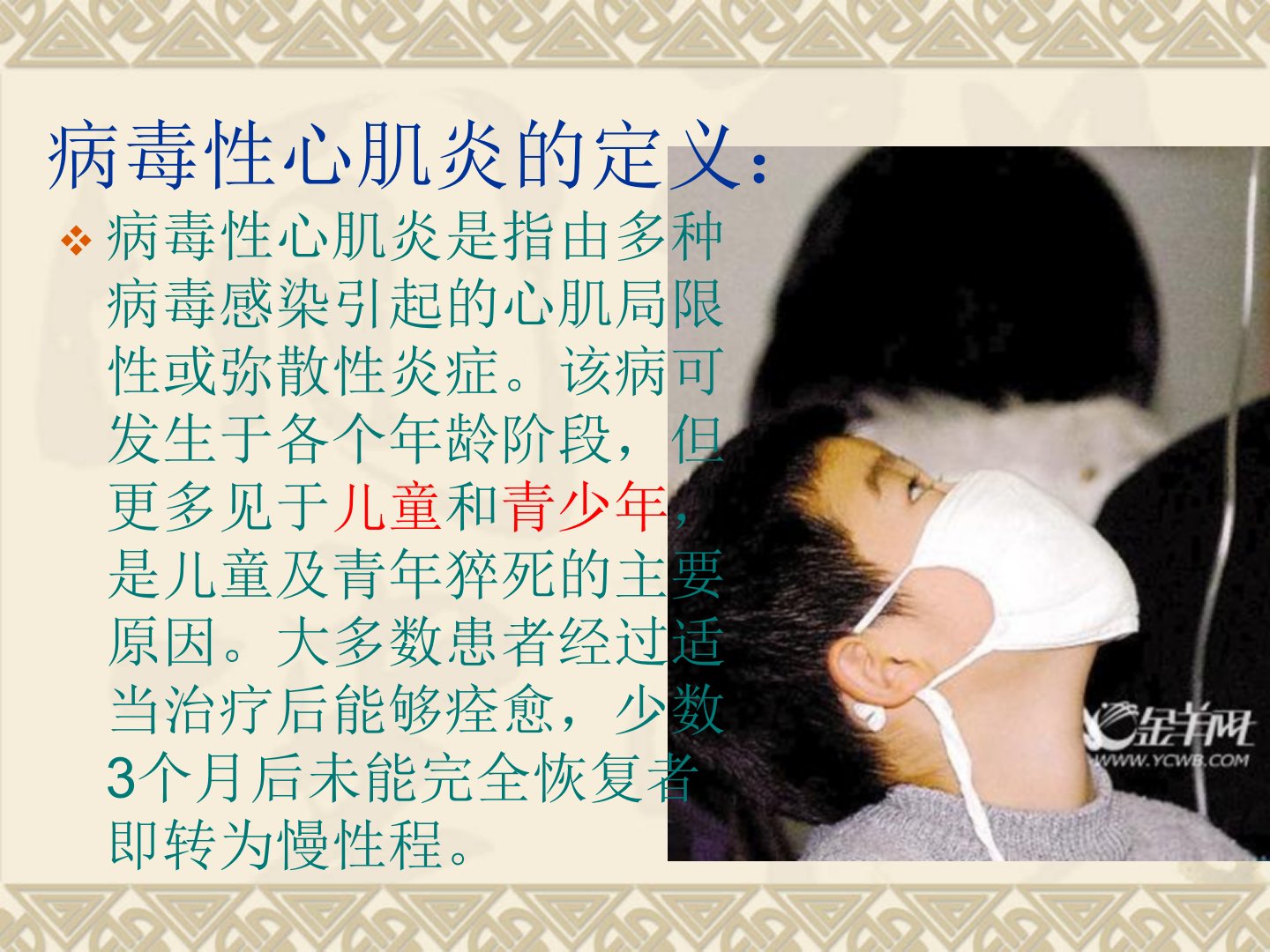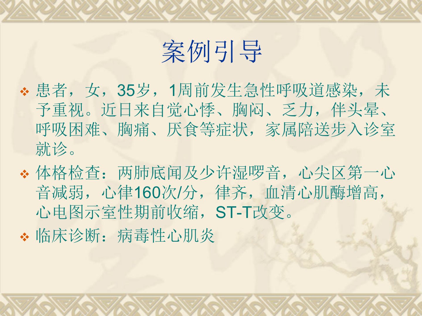 患者女35岁1周前有急性呼吸道感染史近日出现心悸、胸闷等症状就诊后体格检查显示两肺底有湿啰音心尖区第一心音减弱心律快血清心肌酶增高心电图示室性期前收缩等诊断为病毒性心肌炎。病毒性心肌炎儿童青少年多发多由柯萨奇病毒感染引起其它病毒也可致病机体抵抗力下降时更易发生。其发病机制、临床表现取决于病变程度轻重变异大约半数患者发病前有感染史常先有发热等症状然后出现心脏相关症状少数出现心衰或心源性休克。体格检查可发现心动过速、心律失常、心脏扩大等体征。护理上一要确保环境安静舒适以休息为主逐渐增加活动量;二要保证饮食三高多吃含VC食物戒烟限酒;三要关心患者解除焦虑;四要密切观察生命体征做好抢救配合。