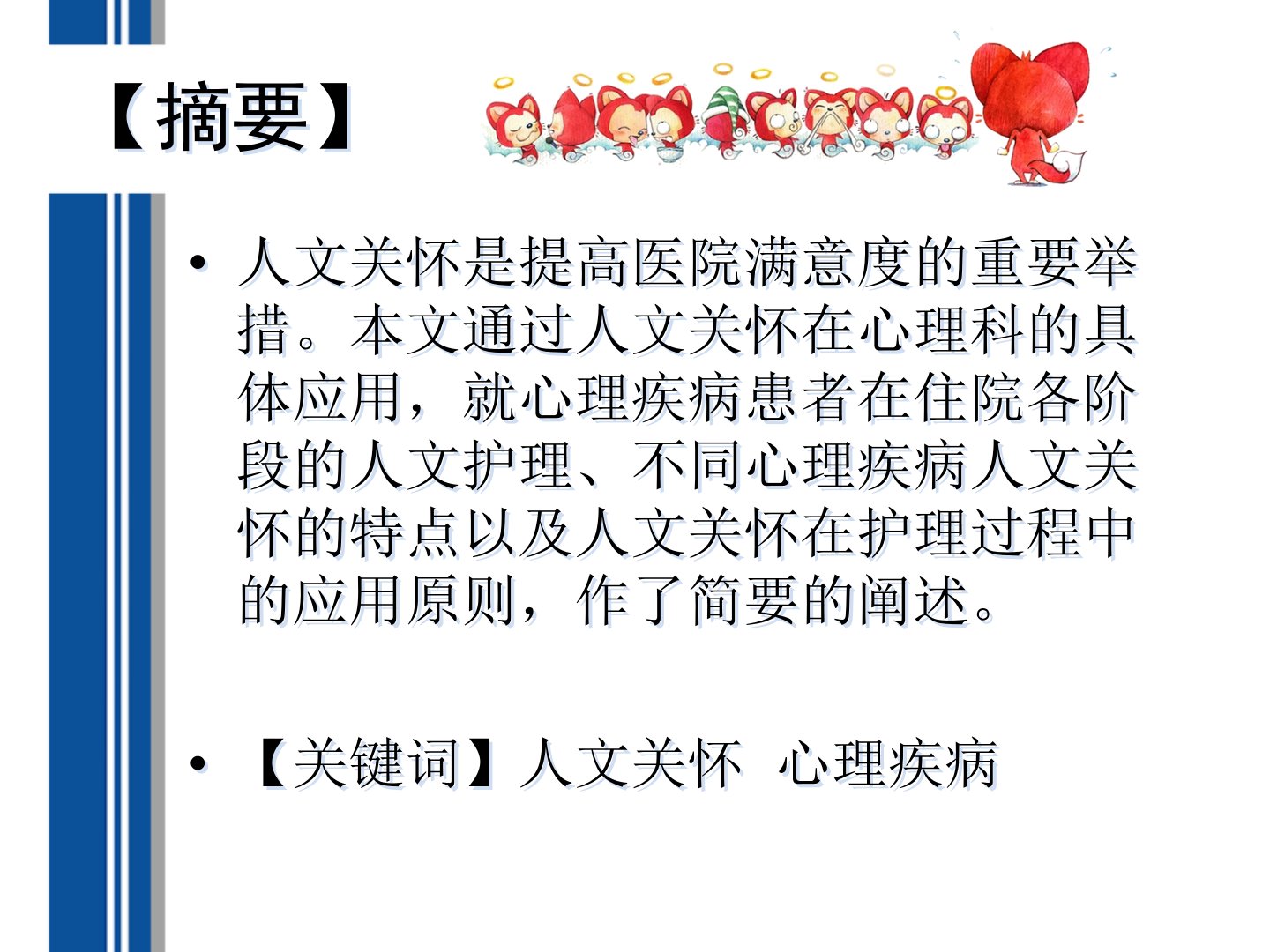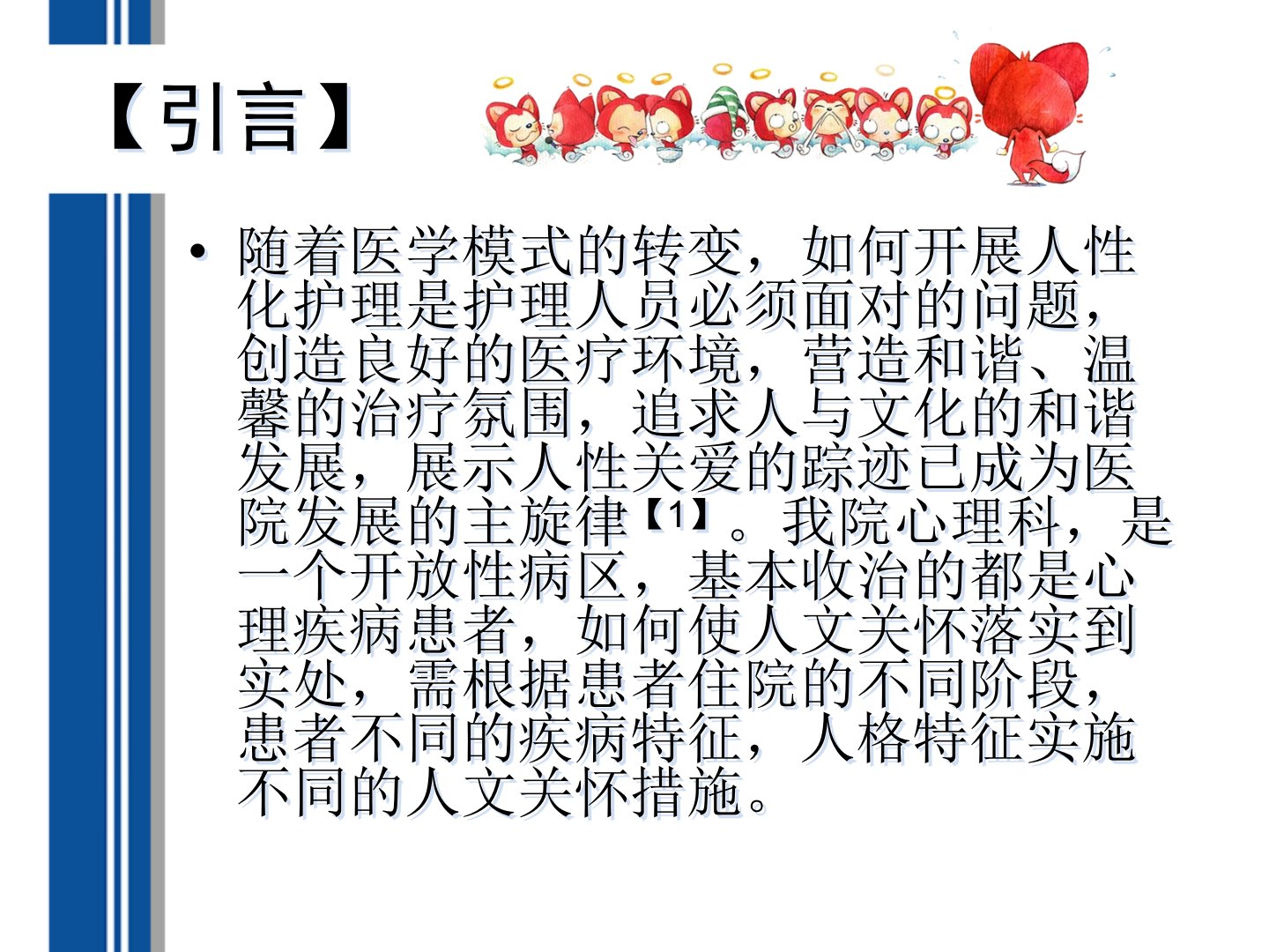 刘志文在江西省心理康复中心的研究聚焦心理疾病患者的人文关怀护理。新入院患者常感不安、疑虑护士应主动介绍环境、制度鼓励病友交流以减轻其恐惧焦虑。住院期间护士需深入了解患者心理问题、个性等以热情真诚的态度与患者交流使其感到温暖被理解。即将出院的患者可能对回归社会有恐惧护士应举办告别仪式建立健康绿色通道制定康复计划。对于不同心理疾病患者护士应采取不同关怀策略:对抑郁症患者认真倾听、鼓励情绪表达;对焦虑症患者阻断精神交互作用提高认知;对强迫症患者给予正确心理疏导鼓励自我接纳。人文关怀在护理中的应用需遵循爱、精、异原则即要爱自己、工作、病人;以热情服务态度和人性化护理转化患者情绪;体现个性化护理满足不同患者心理需求。同时人文关怀应涵盖患者和家属采取多样心理治疗形式重点提高护理人员素质。