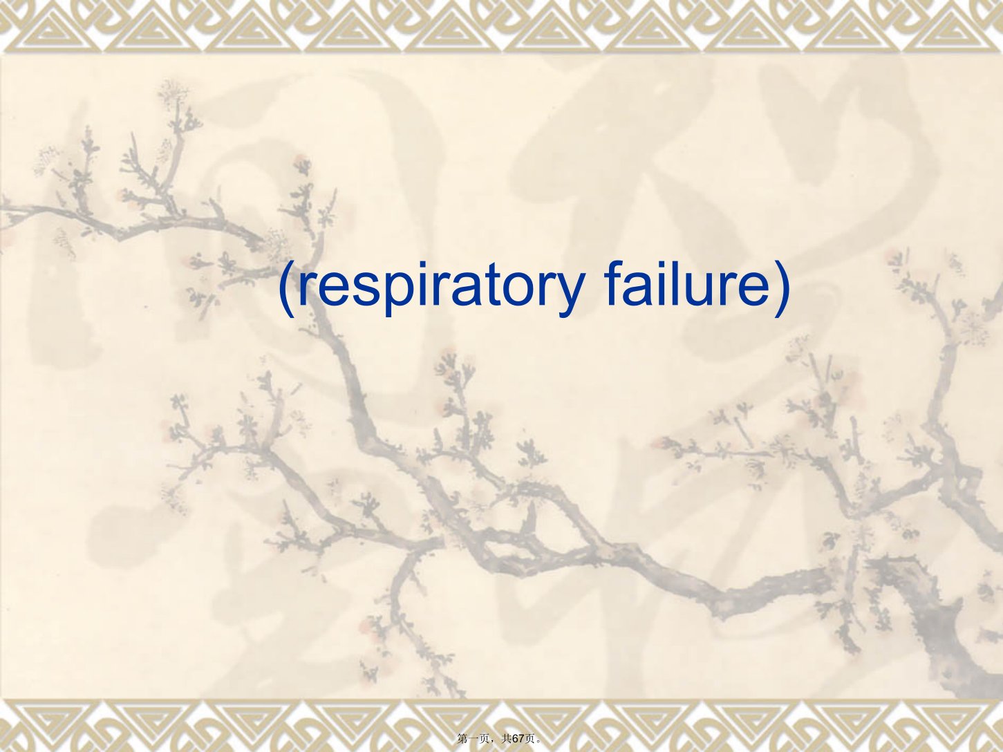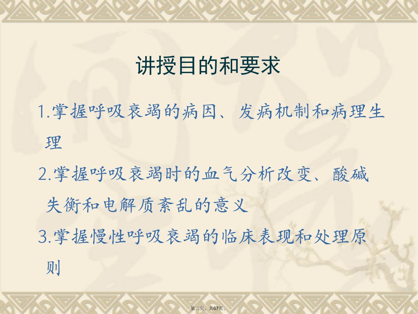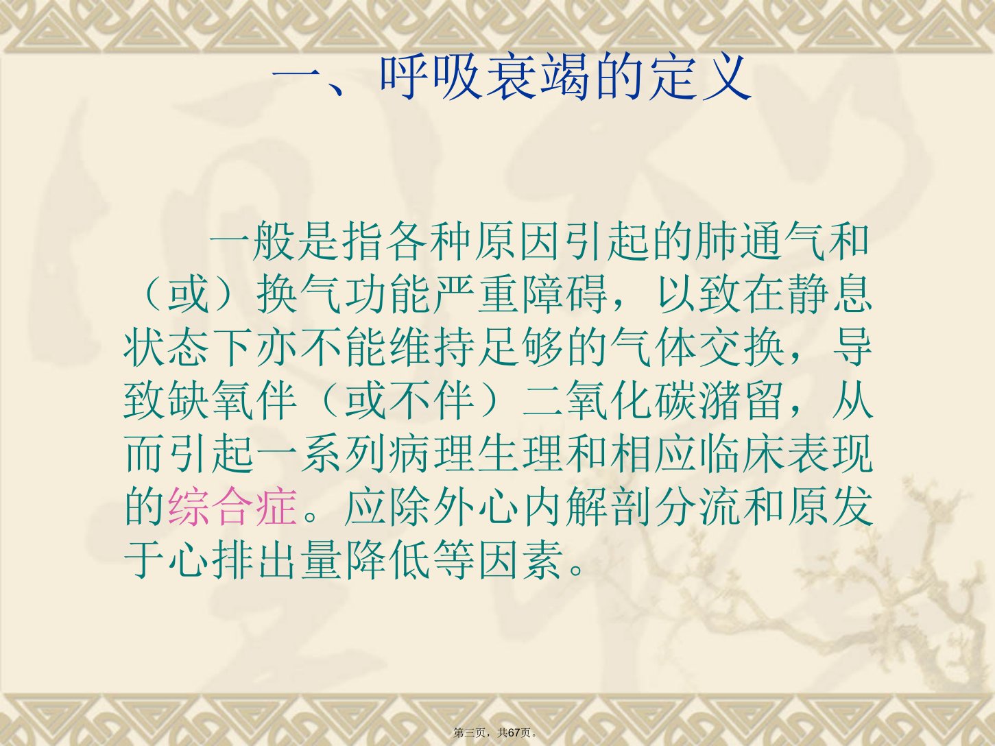 (respiratoryfailure)第一页,共67页。1.掌握呼吸衰竭的病因、发病机制和病理生理2.掌握呼吸衰竭时的血气分析改变、酸碱失衡和电解质紊乱的意义3.掌握慢性呼吸衰竭的临床表现和处理原则讲授目的和要求第二页,共67页。一般是指各种原因引起的肺通气和(或)换气功能严重障碍,以致在静息状态下亦不能维持足够的气体交换,导致缺氧伴(或不伴)二氧化碳潴留,从而引起一系列病理生理和相应临床表现的综合症。应除外心内解剖分流和原发于心排出量降低等因素。一、呼吸衰竭的定义第三页,共67页。通常血气诊断:海平面、静息状态及呼吸空气的情况下,动脉血氧分压(PaO2)<60mmHg和(或)动脉血二氧化碳...