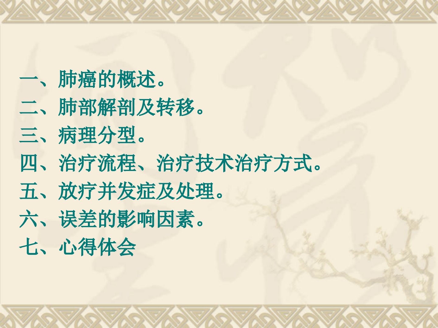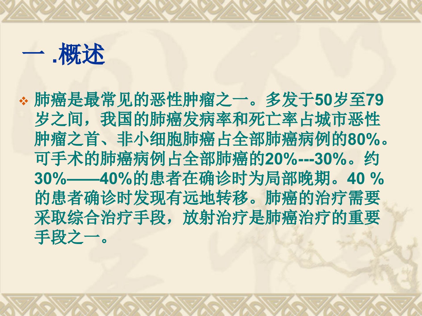肺癌的放射治疗一、肺癌的概述。二、肺部解剖及转移。三、病理分型。四、治疗流程、治疗技术治疗方式。五、放疗并发症及处理。六、误差的影响因素。七、心得体会一.概述肺癌是最常见的恶性肿瘤之一。多发于50岁至79岁之间,我国的肺癌发病率和死亡率占城市恶性肿瘤之首、非小细胞肺癌占全部肺癌病例的80%。可手术的肺癌病例占全部肺癌的20%---30%。约30%——40%的患者在确诊时为局部晚期。40%的患者确诊时发现有远地转移。肺癌的治疗需要采取综合治疗手段,放射治疗是肺癌治疗的重要手段之一。肺癌的概念、病因及临床表现肺癌:是起源于支气管上皮或肺泡上皮的癌症。大多先发生在支气管上皮。肿瘤的上皮细胞不正常生长...