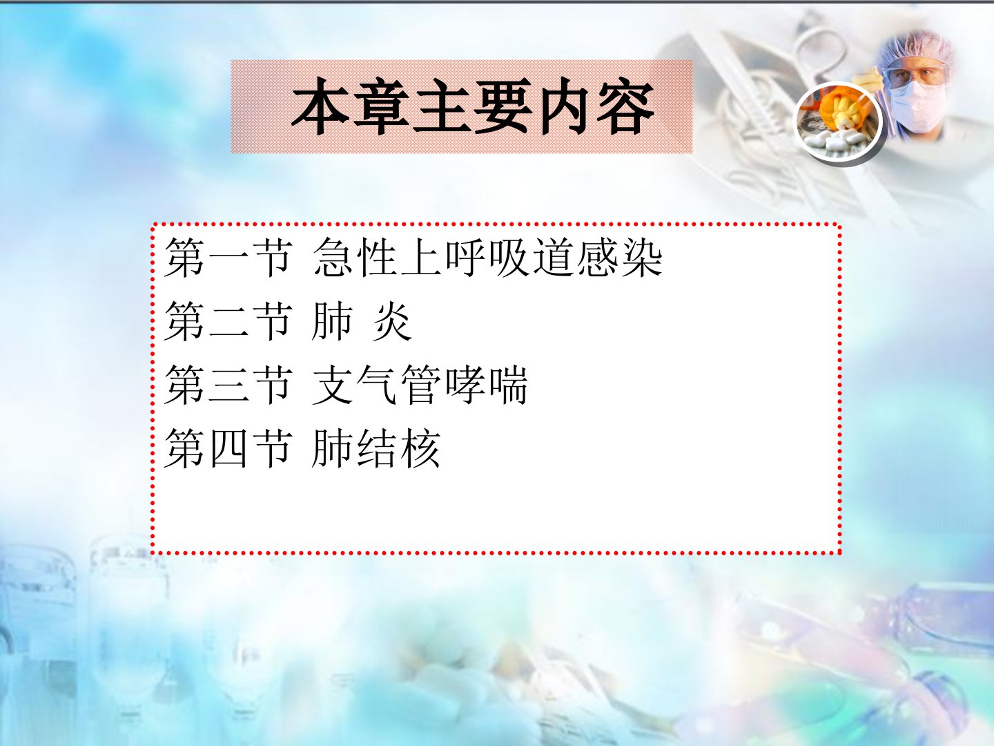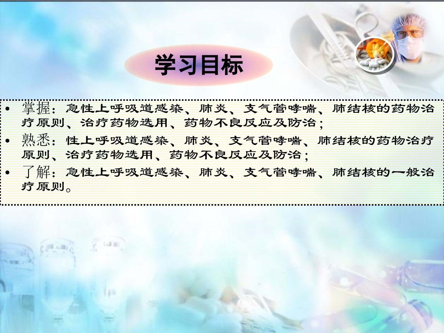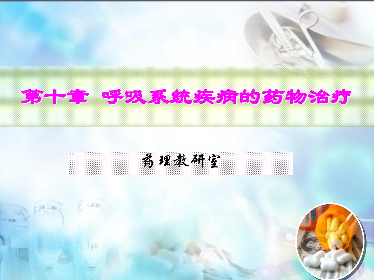 第十章呼吸系统疾病的药物治疗药理教研室掌握:急性上呼吸道感染、肺炎、支气管哮喘、肺结核的药物治疗原则、治疗药物选用、药物不良反应及防治;熟悉:性上呼吸道感染、肺炎、支气管哮喘、肺结核的药物治疗原则、治疗药物选用、药物不良反应及防治;了解:急性上呼吸道感染、肺炎、支气管哮喘、肺结核的一般治疗原则。学习目标本章主要内容急性上呼吸道感染:是鼻、鼻咽部和咽喉部急性炎症的总称,多由病毒感染所致。即平时所说的感冒。表现:咽喉疼痛、咳嗽、发热、全身酸痛、喷嚏、鼻塞、流涕、畏光、流泪、咽部充血、扁桃体肿大等。分类:①普通感冒:是一种急性上呼吸道病毒感染。以鼻咽部卡他症状为主要表现。②流行性感冒:是流感病毒引起...