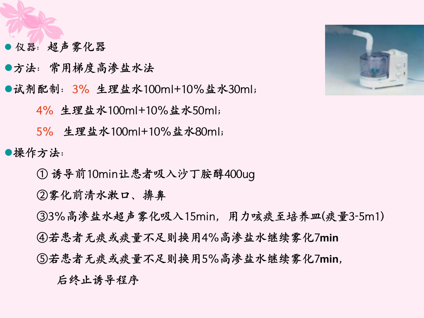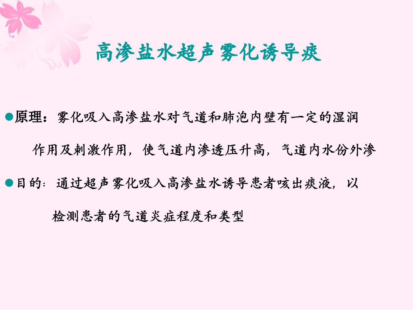 呼吸系统疾病相关检查包括:1高渗盐水超声雾化诱导痰:通过超声雾化吸入高渗盐水诱导患者咳出痰液以检测气道炎症程度和类型。常用梯度高渗盐水法操作前需解释避免患者焦虑重症哮喘患者不宜进行操作中密切观察出现不良反应立即停止并处理。2支气管舒张试验:通过测定吸入支气管扩张剂前后FEV1的变化判断气道阻塞可逆性主要用于诊断支气管哮喘。正常成人吸入2激动剂后FEV1增加量吸人支气管扩张剂20min后增加15且绝对值200ml为支气管舒张试验阳性表示气道反应性增高。3支气管激发试验:诊断支气管哮喘缓解期无症状但肺功能正常怀疑哮喘者的试验方法。用非特异性物质或特异性抗原吸入根据FEV1下降判断。试验前受试者应休息了解病史排除禁忌症基础肺通气功能达标才能进行。试验前应停用可能干扰结果药物激发试验阳性即气道反应性增高阴性为正常结果可疑可复查。禁忌症包括心肺功能不全等副作用有头痛、面红等。