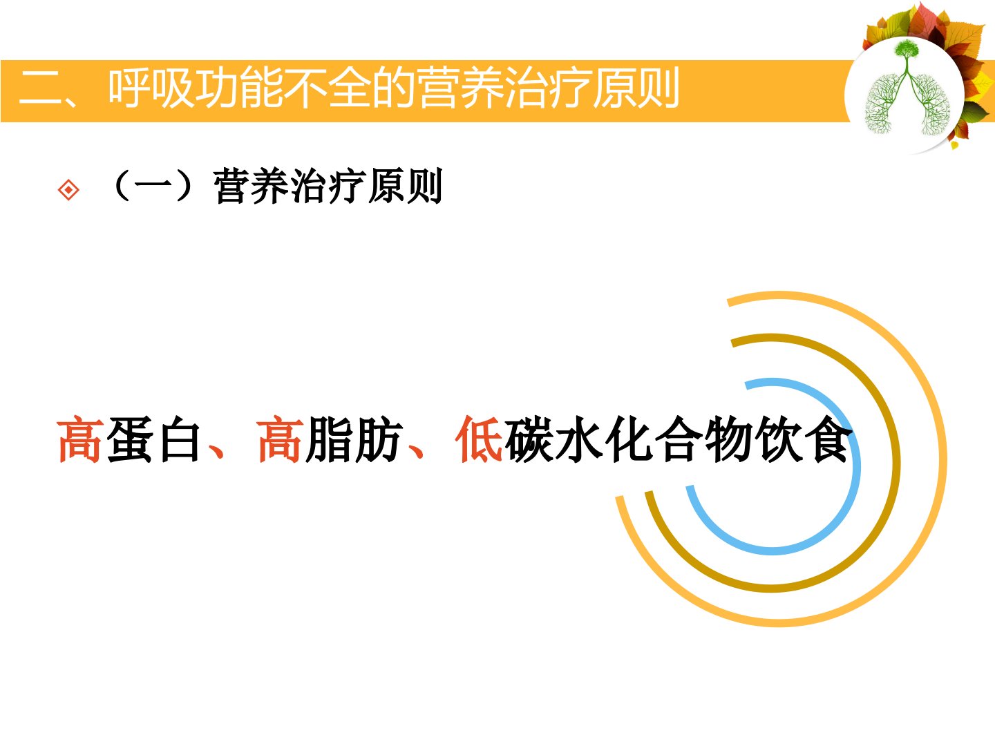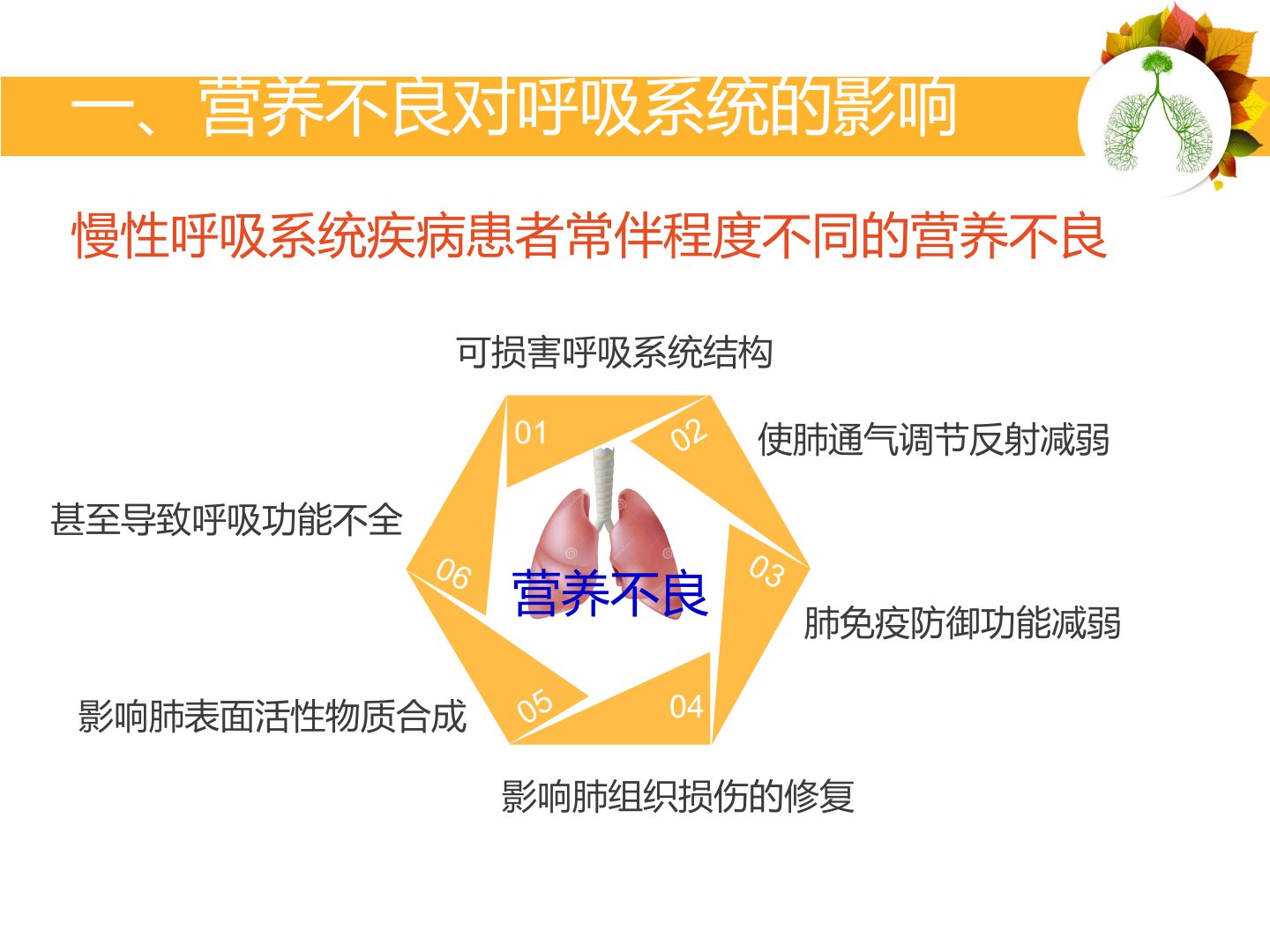 呼吸系统疾病与饮食营养全科医学科一、营养不良对呼吸系统的影响慢性呼吸系统疾病患者常伴程度不同的营养不良010203040506可损害呼吸系统结构使肺通气调节反射减弱肺免疫防御功能减弱影响肺组织损伤的修复甚至导致呼吸功能不全影响肺表面活性物质合成营养不良二、呼吸功能不全的营养治疗原则(一)营养治疗原则高蛋白、高脂肪、低碳水化合物饮食(二)基本方法蛋白质脂肪碳水化合物维生素、矿物质18%-20%30%-35%(或40%)50%(或55%)VC、VA、钙、铁、镁、磷COPD的医学营养治疗COPD的特征是慢性进行性气流受限,这种气流受限通常呈进行性进展、不完全可逆、多与肺部对有害颗粒或有害气体的异常炎...