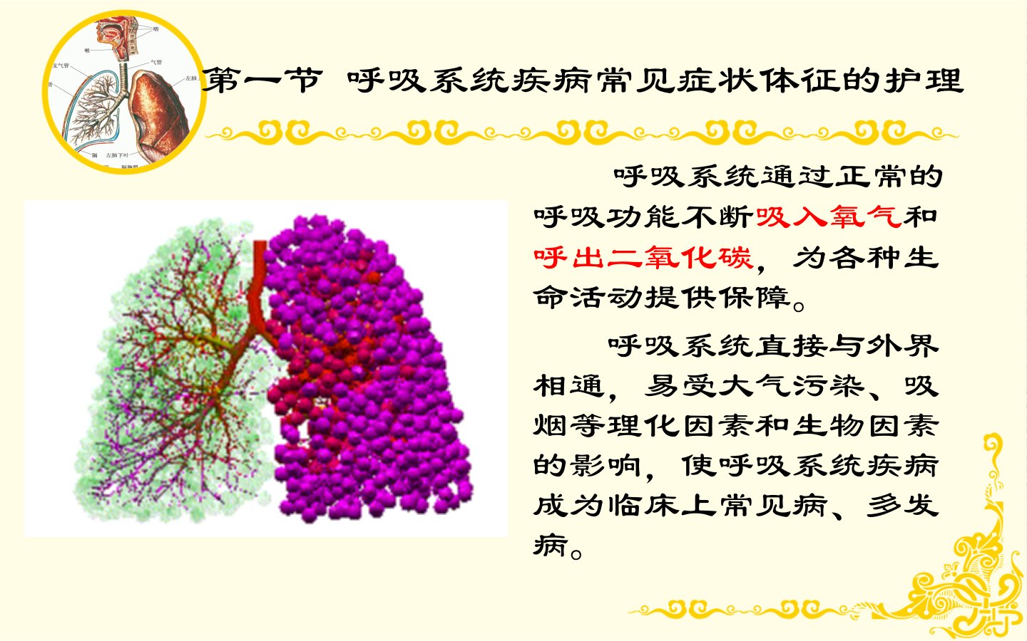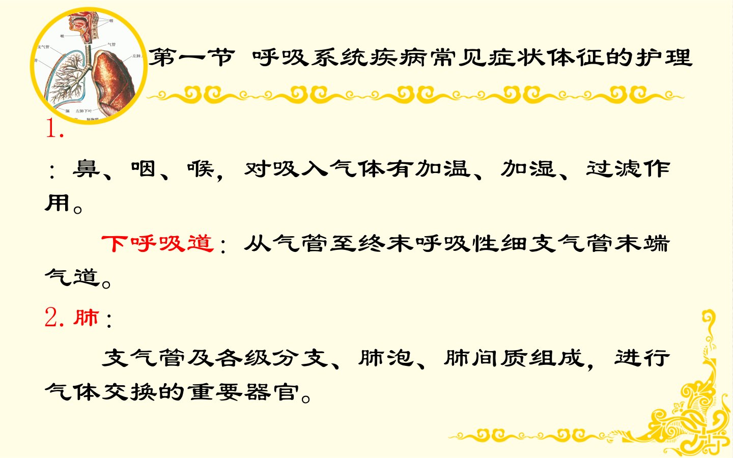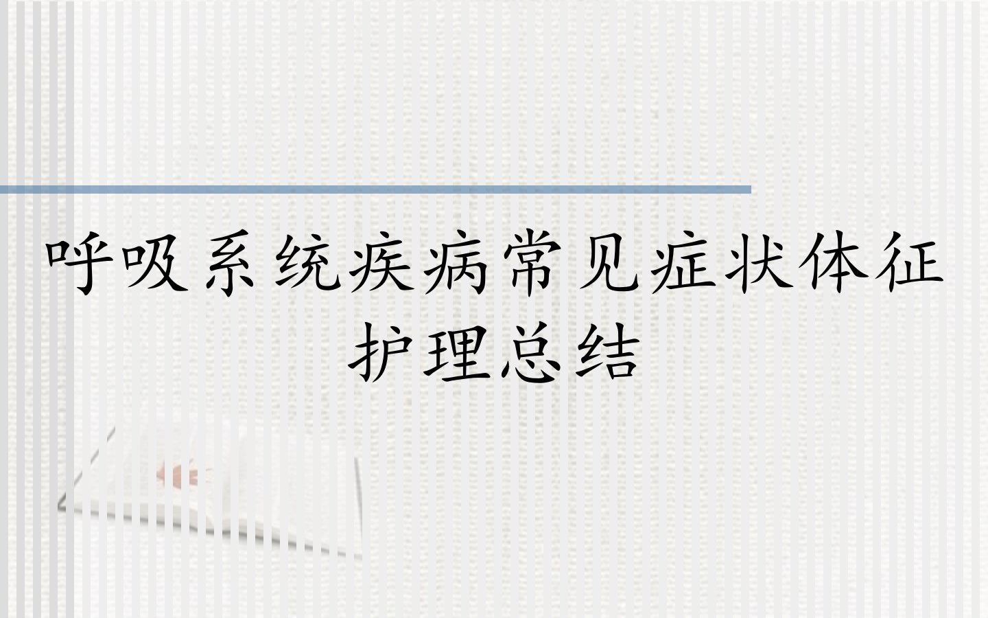 呼吸系统疾病常见症状体征护理总结第一节呼吸系统疾病常见症状体征的护理1.:鼻、咽、喉,对吸入气体有加温、加湿、过滤作用。下呼吸道:从气管至终末呼吸性细支气管末端气道。2.肺:支气管及各级分支、肺泡、肺间质组成,进行气体交换的重要器官。第一节呼吸系统疾病常见症状体征的护理呼吸系统通过正常的呼吸功能不断吸入氧气和呼出二氧化碳,为各种生命活动提供保障。呼吸系统直接与外界相通,易受大气污染、吸烟等理化因素和生物因素的影响,使呼吸系统疾病成为临床上常见病、多发病。第一节呼吸系统疾病常见症状体征的护理呼吸系统常见的症状体征咳嗽咳痰紫绀肺源性呼吸困难胸痛咯血咳嗽、咳痰的护理一.定义咳嗽是呼吸道黏膜受刺激引起...