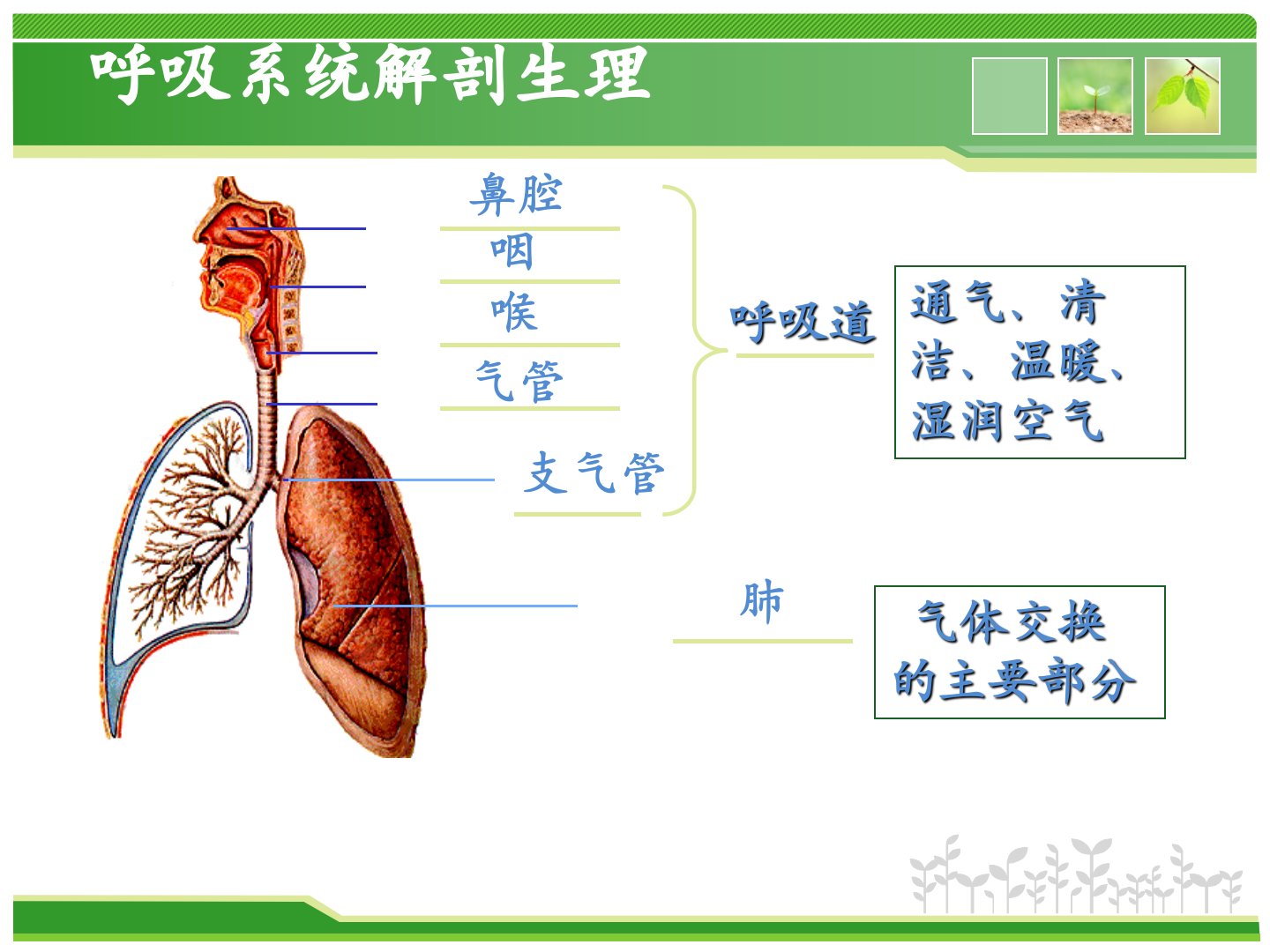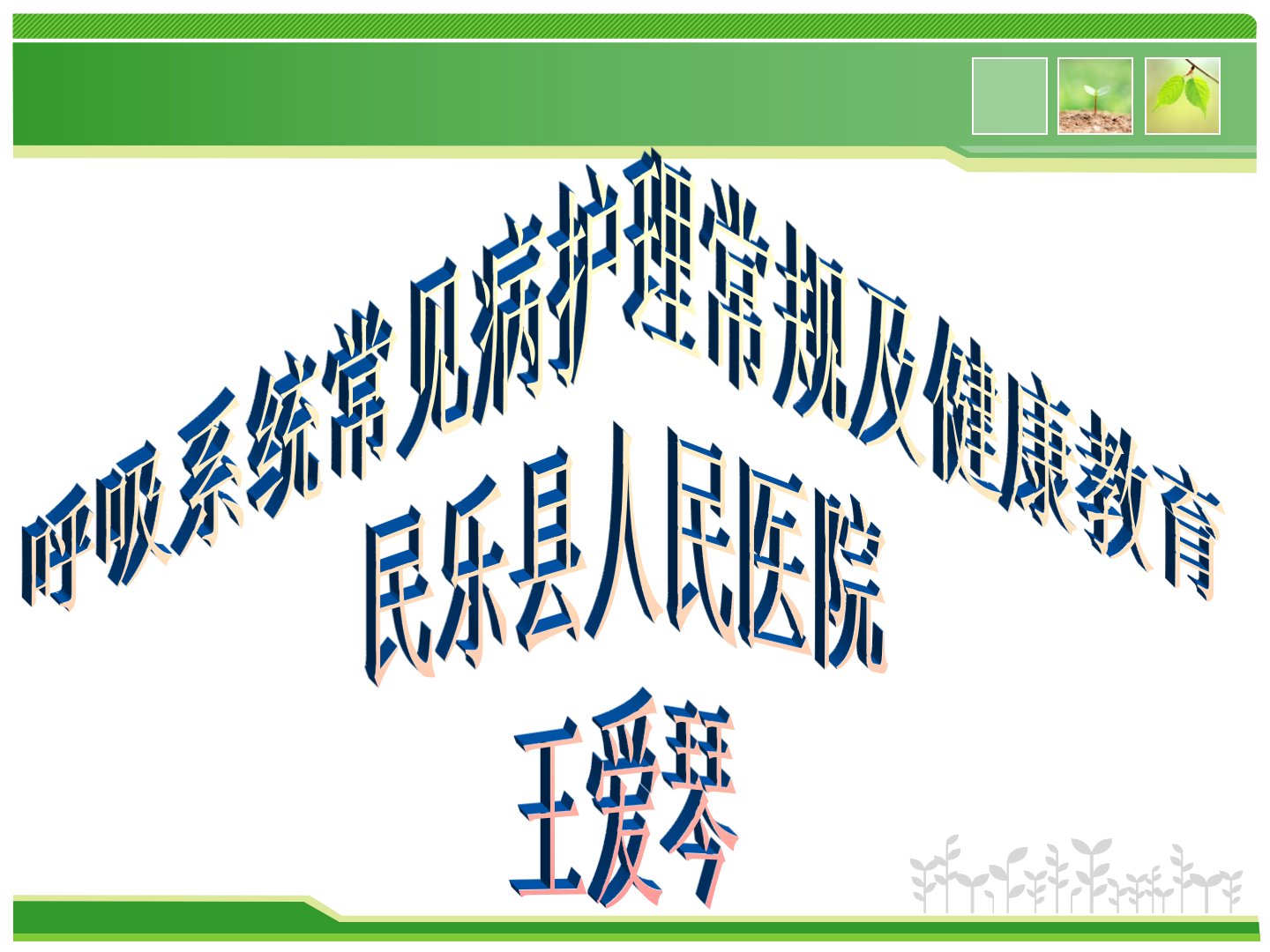 呼吸系统常见疾病护理常规及健康教育呼吸系统常见病护理常规及健康教育民乐县人民医院王爱琴咽喉气管支气管呼吸道肺通气、清洁、温暖、湿润空气气体交换的主要部分鼻腔呼吸系统解剖生理呼吸系统作用:摄取氧气,排出二氧化碳,确保新陈代谢的正常进行和内环境的相对稳定。呼吸呼气吸气平静呼吸:肺内压>大气压,气体经呼吸道出肺胸廓容积缩小,肺被动缩小膈肌和肋间外肌舒张,肋骨和膈肌弹性回位,缩小胸廓上下、前后、左右径肺内压<大气压,气体经呼吸道入肺胸廓容积扩大,肺在胸膜腔负压作用下被动扩张(因肺无主动扩缩的组织结构)膈肌收缩使膈顶下移,增大胸廓的上下径肋间外肌收缩使肋骨上提,扩大胸廓前后、左右径吸气呼气呼吸功能监护一...