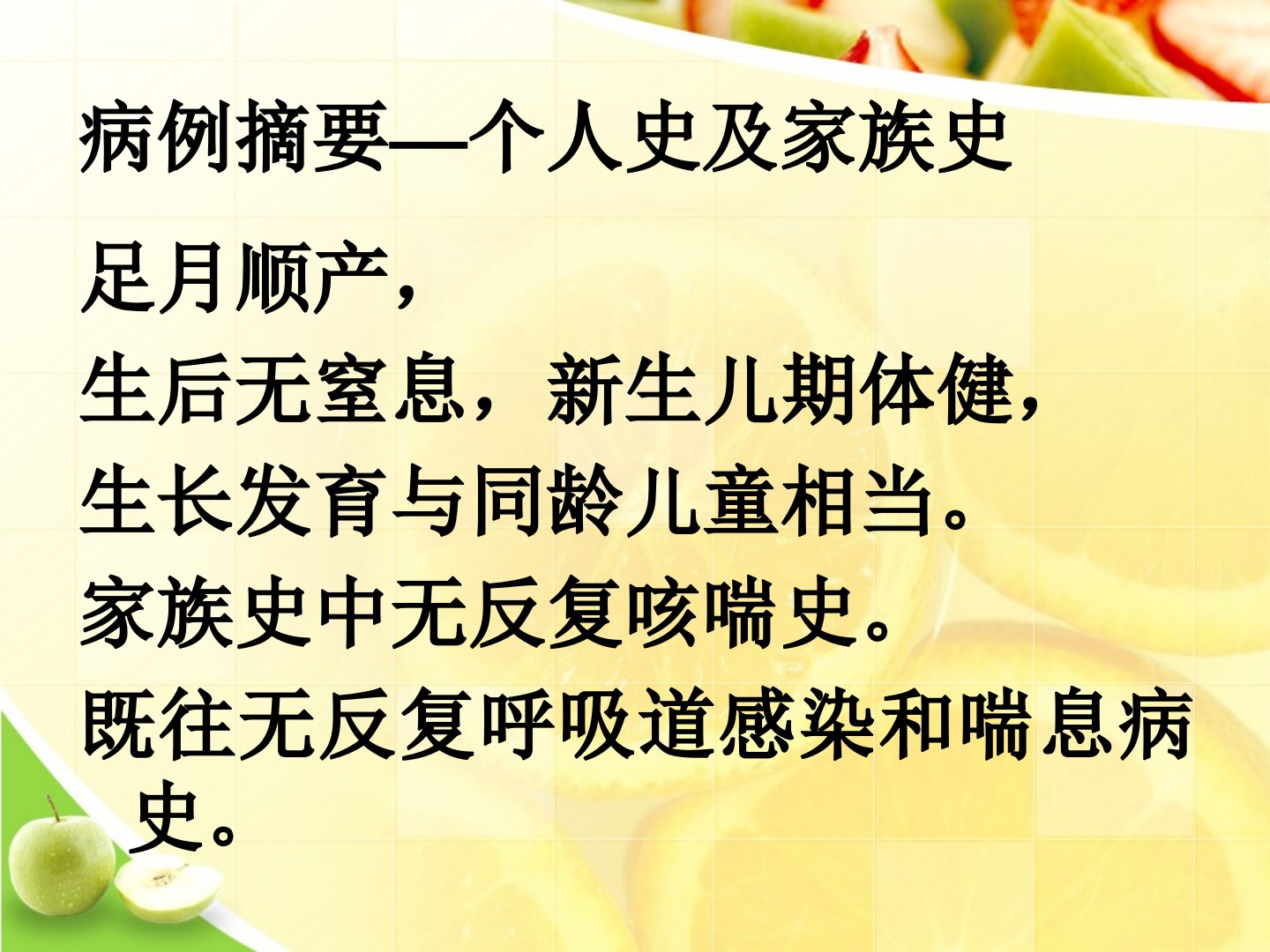 呼吸系统病例腺病毒肺炎病例摘要—个人史及家族史足月顺产,生后无窒息,新生儿期体健,生长发育与同龄儿童相当。家族史中无反复咳喘史。既往无反复呼吸道感染和喘息病史。病例摘要—体格检查体温39℃,呼吸50/min,心率170/min,神志清楚,精神反应弱,呼吸促,左上臂可见卡介苗瘢痕1枚,有鼻翼煽动,口唇稍绀,口周发青,咽充血,可见多量粘稠分泌物,气管居中,可见三凹征,胸廓对称,双侧呼吸运动一致,双侧叩清音,呼吸音粗,双肺可闻及中小水泡音,心音稍钝,律齐,各瓣膜区未闻及杂音。腹软,肝肋下3cm,剑下1.5cm,质中,边钝。四肢、神经系统查体无异常。病例摘要—辅助检查(1)血常规:白细胞10.4×10...