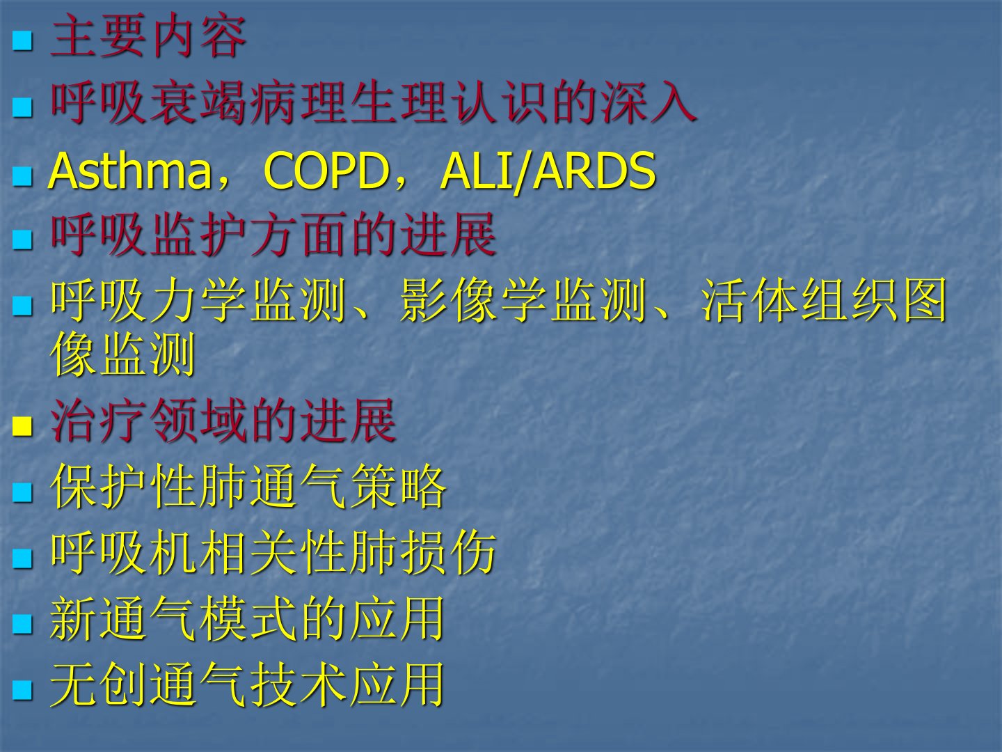 内蒙古医学院崔丽英医生阐述了呼吸衰竭的诊断与治疗进展。呼吸衰竭指无法维持正常组织氧运输或二氧化碳排出的病理状态其诊断结合Campbell标准与病史、临床状态判断。低氧血症的病理生理机制复杂包括通气血流比例失调、肺内分流等多种因素。呼吸衰竭可分为夜间多通气障碍、慢性呼吸衰竭等类型诊断时需关注多导睡眠监测、跨膈压测定等。COPD呼吸衰竭主要机制是通气血流比例失调及生理死腔量增大治疗目标是减轻肺过度充气、改善呼吸肌疲劳。ARDS的病理生理特征包括肺实变、顺应性降低等影像学有弥漫性肺泡渗出等表现。重症哮喘、COPD、ARDS机械通气要点包括通气模式与参数设置。NIPPV应用指征扩大但禁忌证需掌握。无创正压通气技术操作中需关注管路、参数确定等问题患者不耐受多由操作不当或教育不够引起。