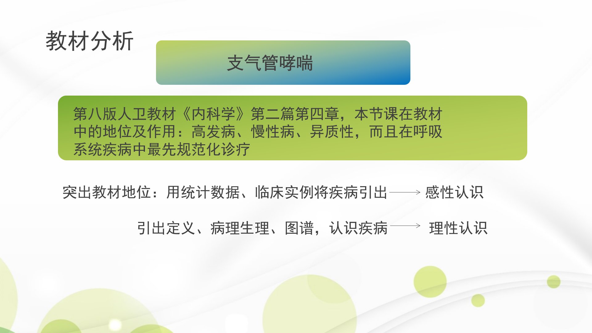 《内科学》支气管哮喘说课摘要本次说课内容为《内科学》中支气管哮喘章节。教材选用第八版人卫教材支气管哮喘作为高发病、慢性病在呼吸系统疾病中率先实现规范化诊疗地位突出。教学目标涵盖知识、能力及公共目标三方面旨在让学生掌握疾病定义、临床表现、治疗方法等知识具备诊断标准解读、病情评估等能力同时注重医学德育教育培养学生人文关怀与沟通能力。教学重点为支气管哮喘的诊断、鉴别诊断及治疗难点在于发病机制、病理生理及病情评估。学生基础理论尚可但临床经验空白学习主动性有别。教学中通过名人案例引出概念用不同语气语调强调重点难点。课后设置复习思考题涵盖临床特征、诊断标准及鉴别诊断。教学反思强调教学相长需发扬教学特色改进不足。
