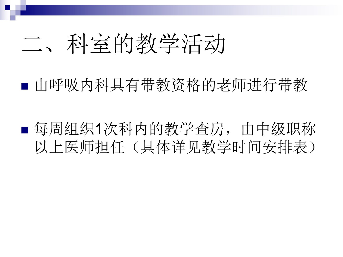 呼吸内科入科教育摘要:1教学活动:由具备带教资格的老师负责每周1次教学查房由中级职称以上医师主持。2工作内容:实习生在上级医师指导下分管病床书写病历参加查房、体格检查值班巡视参与病例讨论及内科常规四大操作。3教学计划及目标:掌握呼吸内科常见病诊治及技能操作如胸腔穿刺术等。4纪律要求:遵守医院规章制度和操作规程服从管理尊重老师完成医疗任务采用背诵方式报告病情遵守24小时住院制关心爱护病人遵守医疗保密制度及时完成病历书写和医疗活动参与随时请示上级医生。5注意事项:常规操作及胸腔闭式引流需在带教老师指导下进行纤维支气管镜及胸腔镜以观摩为主;严格执行请假制度未经批准擅自离院视为旷实习。