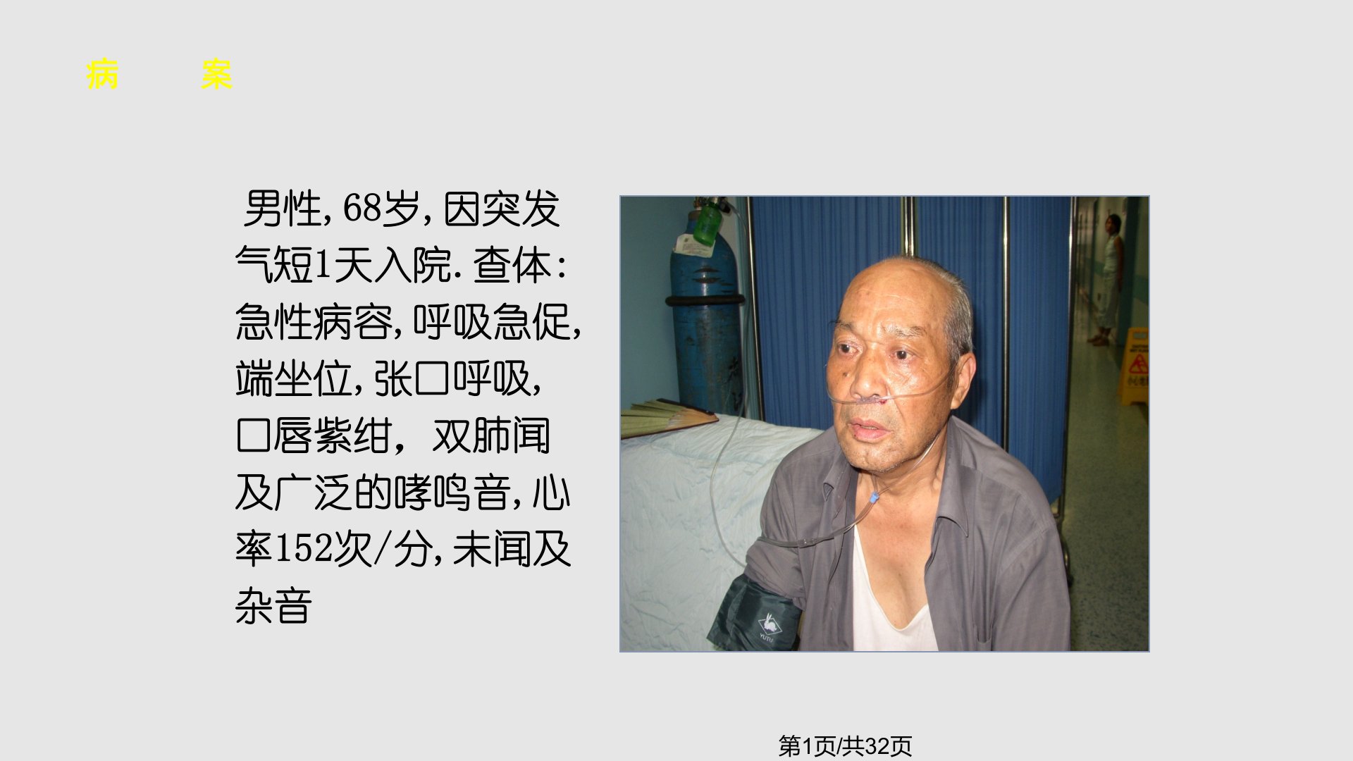 68岁男性患者因突发气短1天入院查体显示急性病容、呼吸急促、端坐张口呼吸、口唇紫绀双肺闻及广泛哮鸣音心率152次分。患者主要症状为呼吸困难具体表现为自觉空气不足、呼吸费力呼吸频率、深度和节律改变出现张口呼吸、端坐呼吸和紫绀辅助呼吸肌参与活动。呼吸困难病因多样包括肺源性、心源性、中毒性、神经精神性和血液性等。其中呼吸系统疾病导致通气、换气功能障碍是肺性呼吸困难的主要机制。心源性呼吸困难则多由心力衰竭引起分为左右心衰左心衰时呼吸困难与肺淤血、肺泡张力、肺泡弹性等有关特点包括活动时加重、休息时减轻、仰卧时加重、坐位时减轻等。本例患者的症状及体征更倾向于心源性呼吸困难尤其是左心衰竭导致的肺淤血。