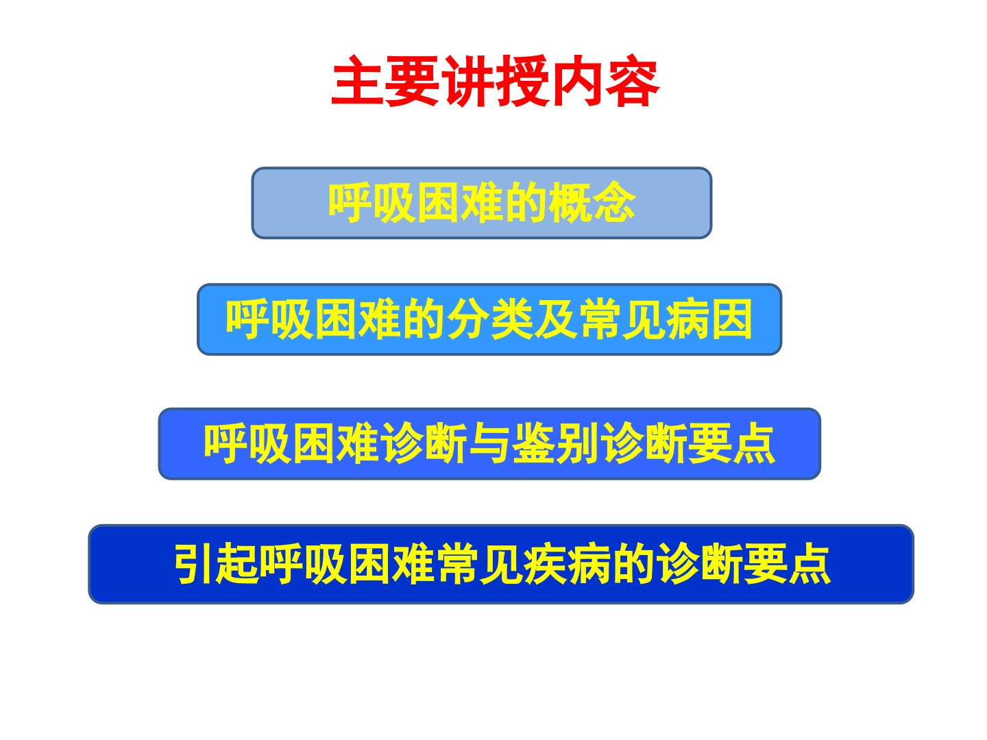 本次讲授聚焦呼吸困难的诊断与鉴别诊断。首先呼吸困难指患者主观感觉空气不足、呼吸费力客观上表现为用力呼吸、呼吸肌参与、通气增加及呼吸频率等改变。其次介绍了呼吸困难的分类及病因按呼气时相分为吸气性、呼气性、混合性呼吸困难;按系统器官疾病分有肺源性(如慢支炎、COPD等)、心源性、中毒性、血源性、神经精神性与肌病性及咽喉疾病引起。诊断要点上病史询问要关注年龄性别、发病急缓、诱发因素、伴随症状、既往病史、工作环境;体格检查包括患者体位、皮肤黏膜、呼吸变化、肺部及胸膜病变体征、心脏病体征等;还需借助辅助检查。最后介绍了常见疾病诊断要点如支气管哮喘、COPD、肺栓塞和肺梗死、急性肺水肿、自发性气胸等各有特征表现。