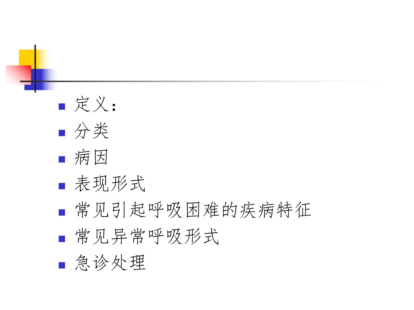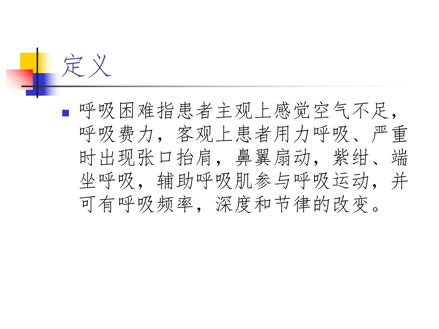 呼吸困难指患者主观感觉空气不足、呼吸费力客观上表现为用力呼吸严重时出现张口抬肩、鼻翼扇动等症状是首位生命体征提示可能患有严重疾病。呼吸困难国际常用HughJones分级分五级判断其严重程度。病因多样包括:1肺源性:由呼吸系统疾病引起如喉部水肿、支气管炎、肺炎等。2心源性:因心力衰竭等导致特点为劳力性呼吸困难端坐呼吸心原性哮喘。3中毒性及代谢性:代谢性酸中毒时呼吸深快急性感染时呼吸加快吗啡等药物中毒时呼吸缓慢。4血原性:红细胞携氧量减少血含氧量减低引起见于重度贫血等。5神经精神性:重症颅脑疾病时呼吸慢而深癔病患者呼吸表浅频速。表现形式分为吸气性、呼气性和混合性呼吸困难。伴随症状可提示不同病因如伴一侧胸痛见于肺炎等伴昏迷见于脑出血等。常见疾病特征如急性肺水肿起病急骤支气管哮喘好发于春夏季等。急诊处理包括消除病因、保持呼吸道通畅、氧疗、使用呼吸兴奋剂、控制感染及纠正电解质和酸碱失衡等措施。