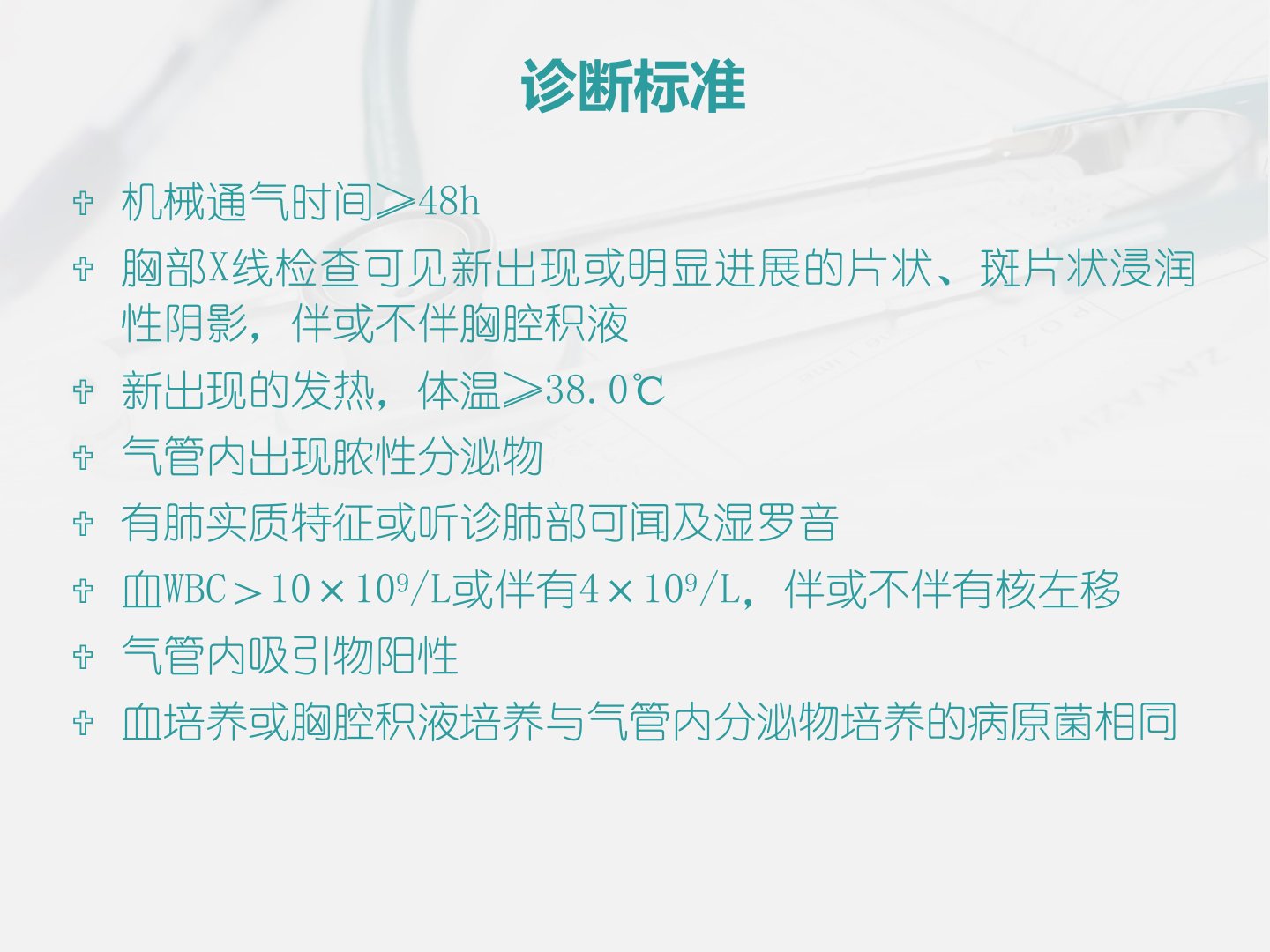 重症医学科刘一潇医生介绍了呼吸机相关性肺炎(VAP)的诊断标准包括机械通气时间、胸部X线检查、发热、气管内脓性分泌物、肺部湿罗音、血象异常及病原菌培养一致性等。VAP发病率高治疗困难病死率高故加强预防至关重要。预防措施包括:1一般防治:严格执行手卫生、无菌操作对特殊患者采取保护性隔离对高危患者用洗必泰漱口。2胃肠道防治:减少应激性溃疡药物使用选用小直径鼻胃管限制镇静剂使用尽早给予肠内营养无禁忌症病人采取半卧位及改良式变换体位法。3人工气道管理:监测气管套囊压力声门下吸引正确吸痰经纤支镜吸痰严格执行无菌操作鼓励患者早期活动进行胸部物理治疗评估撤机和拔管。4机械通气防治:根据镇静水平调整剂量优先考虑无创通气。5呼吸机管理:做好呼吸机清洁消毒定时更换配件注意冷凝水处理。对全体医务人员包括护工定期进行预防措施的教育培训。