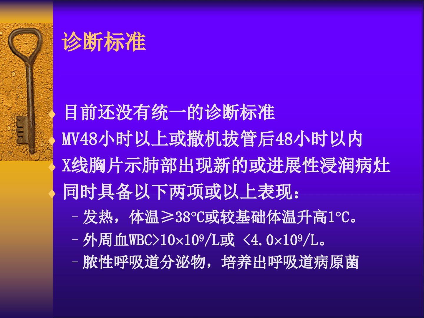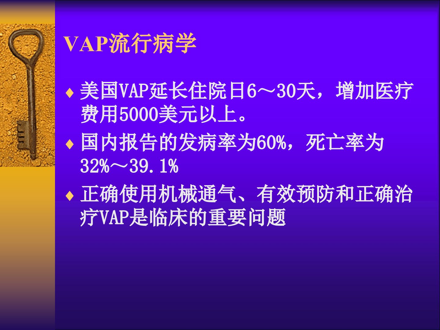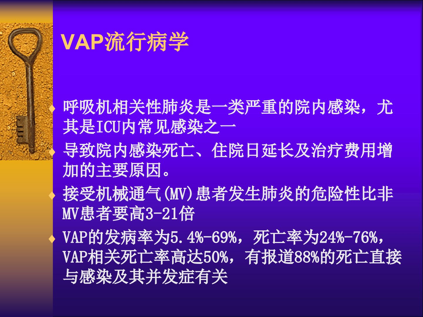 呼吸机相关性肺炎(VAP)是ICU内常见严重院内感染是导致院内感染死亡、住院日延长及治疗费用增加的主要原因。接受机械通气(MV)患者发生肺炎的危险性比非MV患者高321倍VAP发病率546死亡率2476相关死亡率高达50美国VAP延长住院日630天增加医疗费用5000美元以上国内报告发病率60死亡率3239。目前VAP尚无统一诊断标准正确使用机械通气、有效预防和正确治疗VAP是临床重要问题。VAP病原体因地区、医院等而异细菌性肺炎占优势约7087其中G致病菌占6070。VAP病原学变迁主要因素是MV时间和先前抗生素应用史。诊断技术包括无创性技术(气管内抽吸物常规定性培养、定量培养等)和有创性技术(纤支镜引导保护性标本刷PSB技术、支气管肺泡灌洗BAL技术等)但目前技术很难区别细菌定植和感染。
