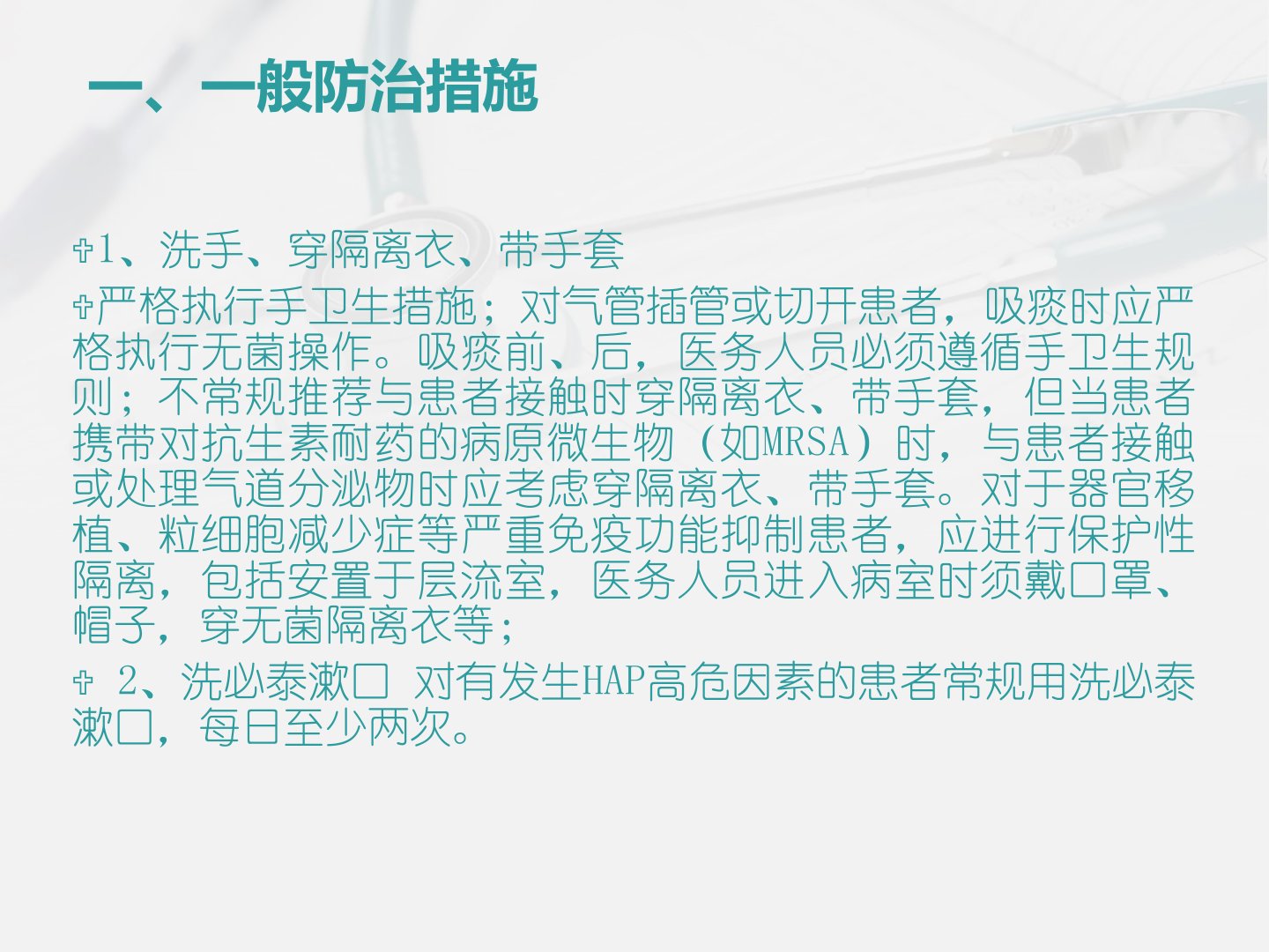 浏阳市人民医院老干科2017年针对呼吸机相关性肺炎(VAP)制定了预防控制措施。一般防治措施包括严格执行手卫生、无菌操作对高危患者用洗必泰漱口对特殊患者进行保护性隔离。与胃肠道有关的措施包括减少应激性溃疡药物使用选用小直径鼻胃管注意鼻饲后有无胃潴留必要时放置鼻肠管并提供充足营养支持。体位防治上无禁忌症病人应采取3045度半卧位以减少反流。人工气道管理包括监测气管套囊压力、声门下吸引、正确吸痰、经纤支镜吸痰、坚持经口插管原则、人工气道护理及胸部物理治疗。机械通气防治上需根据镇静水平调整剂量优先考虑无创通气。机械通气患者呼吸机管理包括清洁消毒、定时更换部件等。最后对全体医务人员包括护工定期进行VAP预防措施的教育培训。