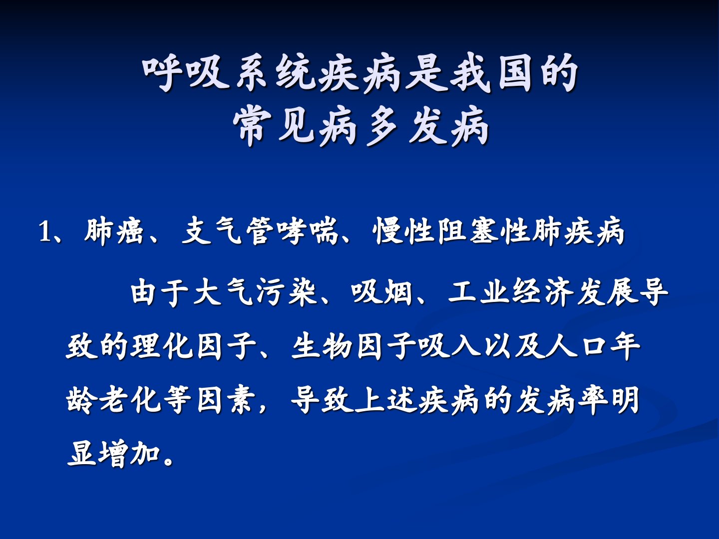 呼吸系统疾病总论摘要呼吸系统结构功能与疾病紧密相关多种因素影响其健康。主要相关因素如下:1大气污染和吸烟:大气污染危害大降尘、二氧化硫增多使慢支急性发作增加;二氧化硅等尘土引发尘肺;工业废气致癌物致肺癌高发。2病原体感染:细菌感染中G杆菌产内酰胺酶细菌、G球菌耐甲氧西林细菌增多;免疫低下者易患真菌、卡氏肺囊虫及非典型分枝杆菌感染;还有军团菌、支原体、衣原体等。不同病原体感染痰液性状不同如大量黄脓痰见于肺脓肿或支气管扩张等。3检查手段:痰液检查可做涂片、培养等;胸腔积液检查和胸膜活检有胸水常规等;影像学检查有透视、胸片等;还可直接窥视支气管粘膜做刷检、活检及肺泡灌洗助明确诊断。治疗方式多样有取异物、激光等。