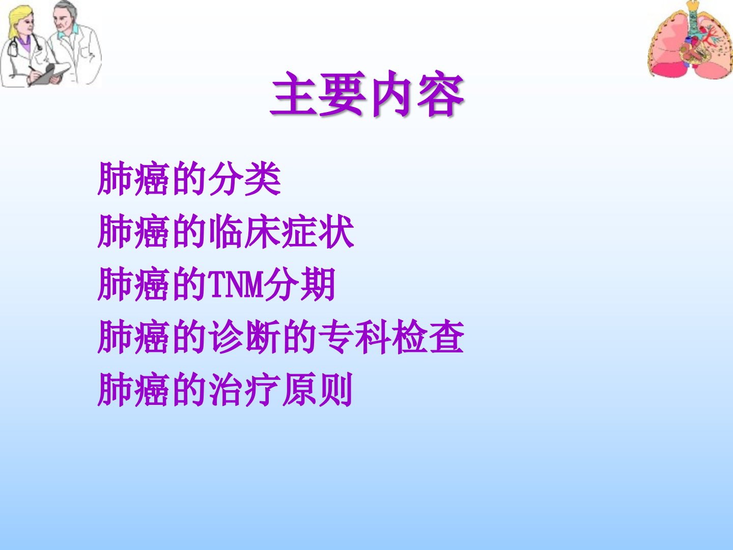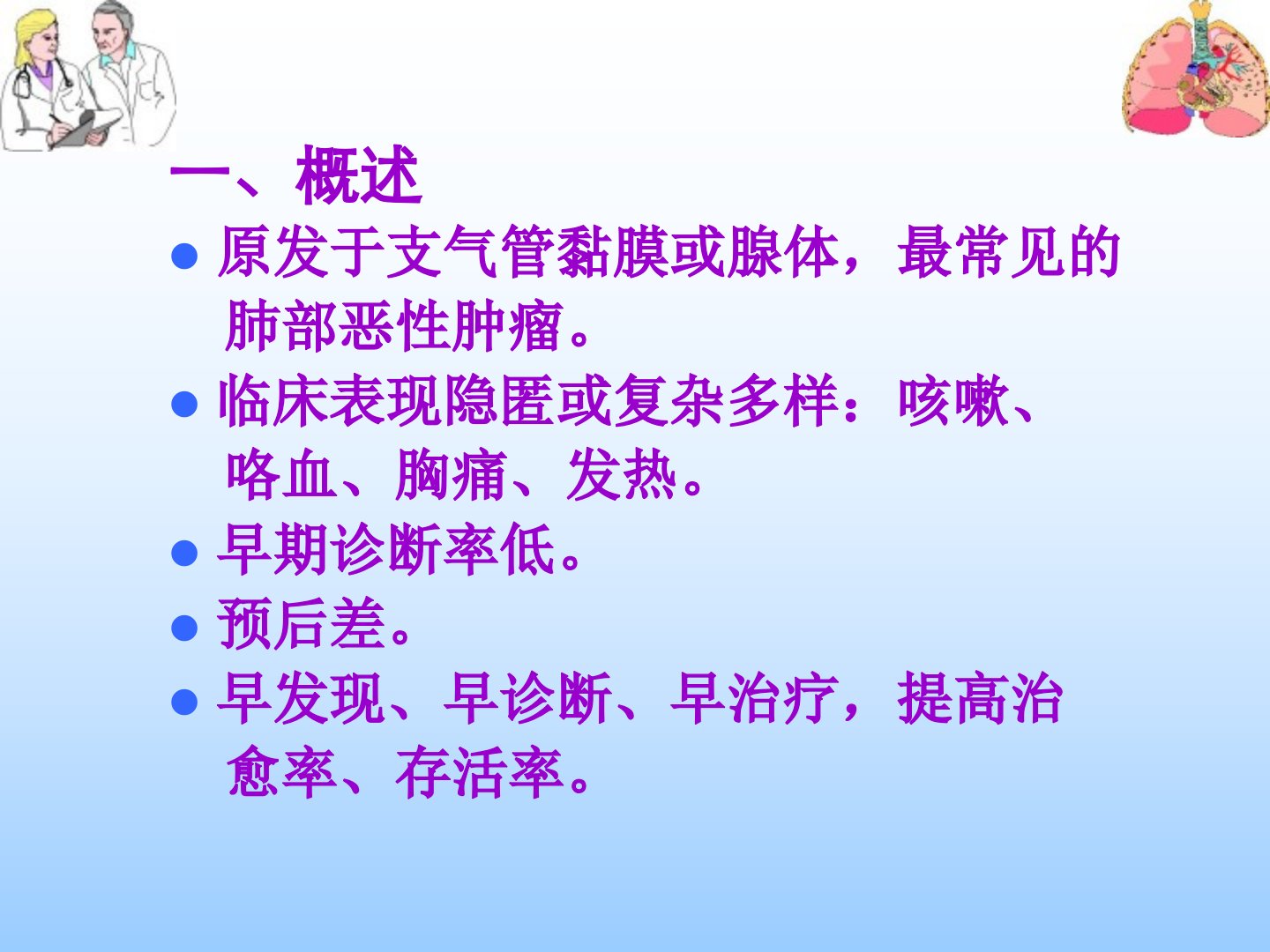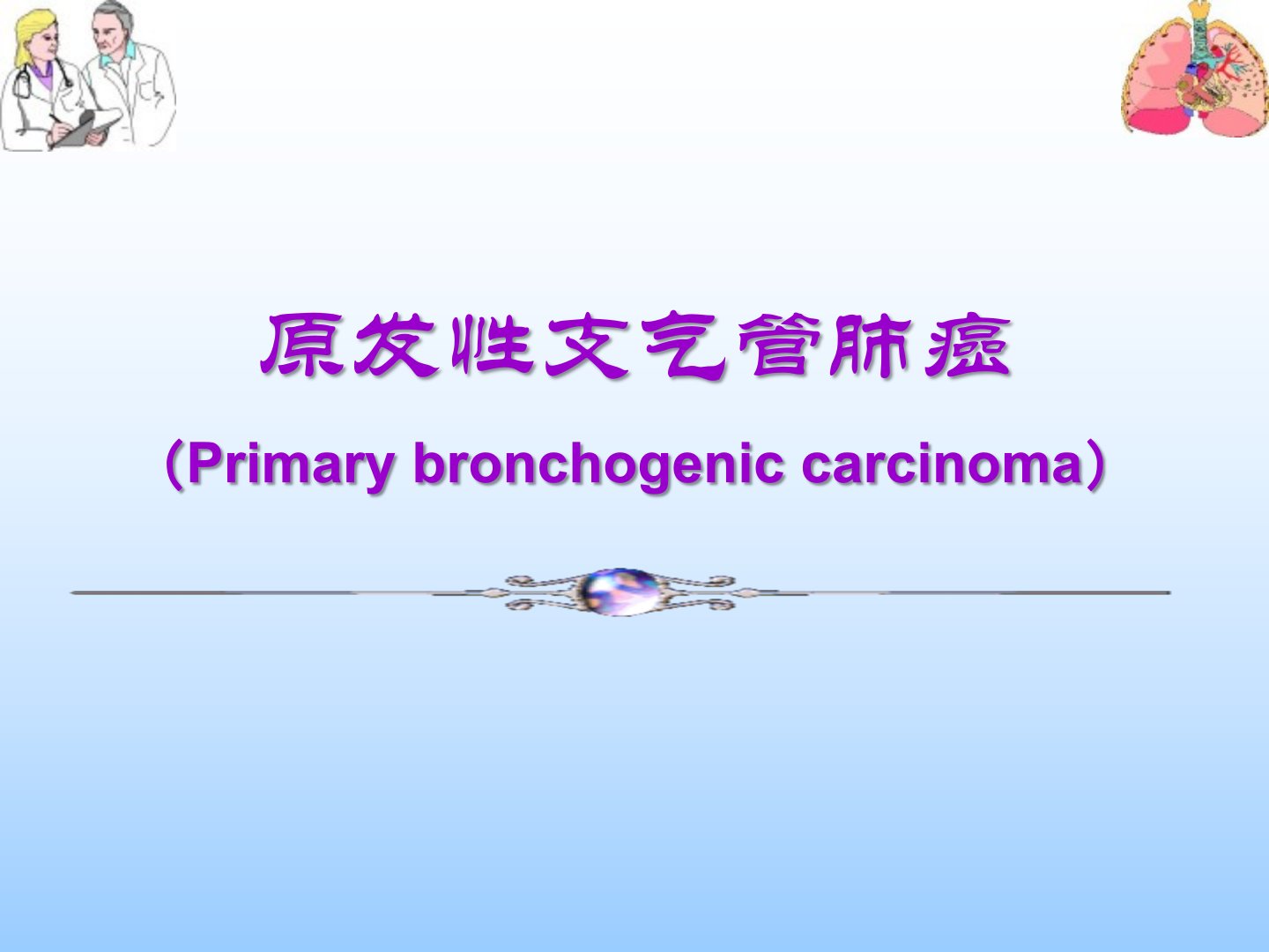 原发性支气管肺癌(Primarybronchogeniccarcinoma)主要内容肺癌的分类肺癌的临床症状肺癌的TNM分期肺癌的诊断的专科检查肺癌的治疗原则一、概述原发于支气管黏膜或腺体,最常见的肺部恶性肿瘤。临床表现隐匿或复杂多样:咳嗽、咯血、胸痛、发热。早期诊断率低。预后差。早发现、早诊断、早治疗,提高治愈率、存活率。流行病学1,肺癌的发病率明显增高。2,癌症死亡中肺癌男性的第一死亡原因,女性第三死亡原因。3,发病年龄多在40岁以上。4,50~70岁最多见。病因未明确,目前公认与以下因素有关(一)吸烟:1.肺癌患者3/4有重度吸烟2.致癌物质:3,4–苯并芘等3.被动吸烟也容易引起肺癌(...