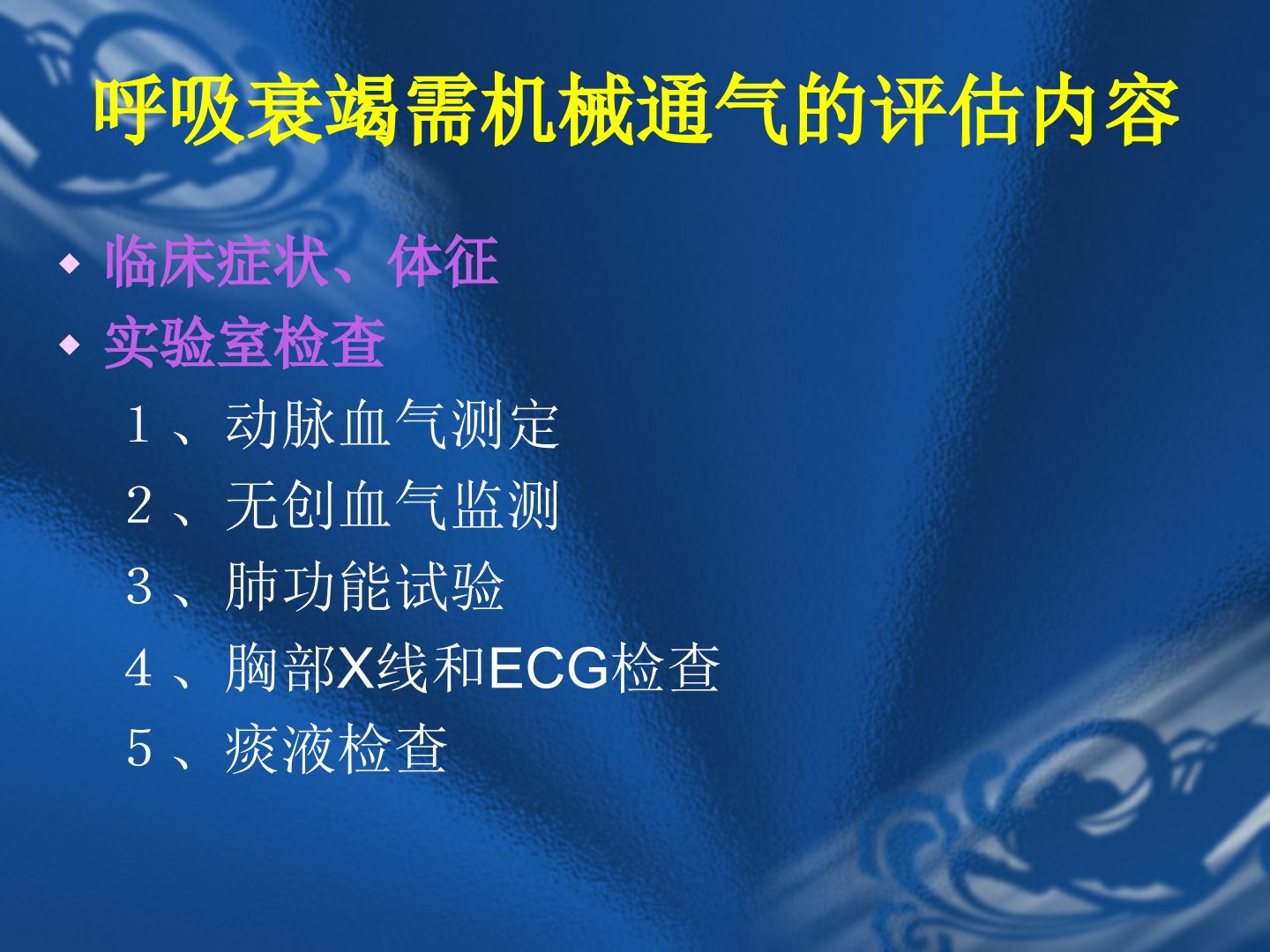 呼吸衰竭需机械通气(MV)的评估涵盖多方面:症状上呼吸困难急缓可提示能否耐受自主呼吸但与呼衰严重程度无密切相关性其他症状如发热、咳嗽等可提示基础疾病;体征方面发绀、呼吸急促、辅助呼吸肌突出使用等有一定参考价值;实验室检查中动脉血气测定可判断氧合与通气情况无创血气监测可连续监测SPO2胸部X线和ECG检查可判断气胸等疾病痰液检查可明确基础肺病诊断肺功能试验中肺活量、MIP、MEP等是判断是否需MV的有用指标。MV适应证包括呼吸停止、各种原因引起的严重急慢性呼吸衰竭等。MV时机把握上呼吸停止应立即进行其余情况倾向于基础疾病短期难纠正或可能窒息者较早MV。成人应用MV有呼吸生理学指标符合任一项即可考虑MV。常见疾病呼吸衰竭MV指征各有不同。确定是否MV要因人而异结合临床经验注重临床指征与疾病趋势反对机械套用指标同时考虑通气治疗目的、益处与害处、病情可逆性及撤机可能性等因素。