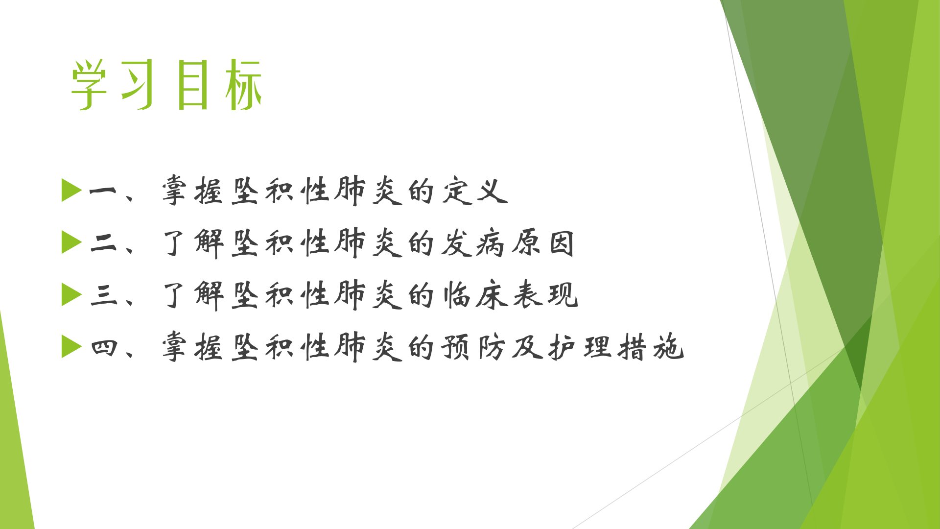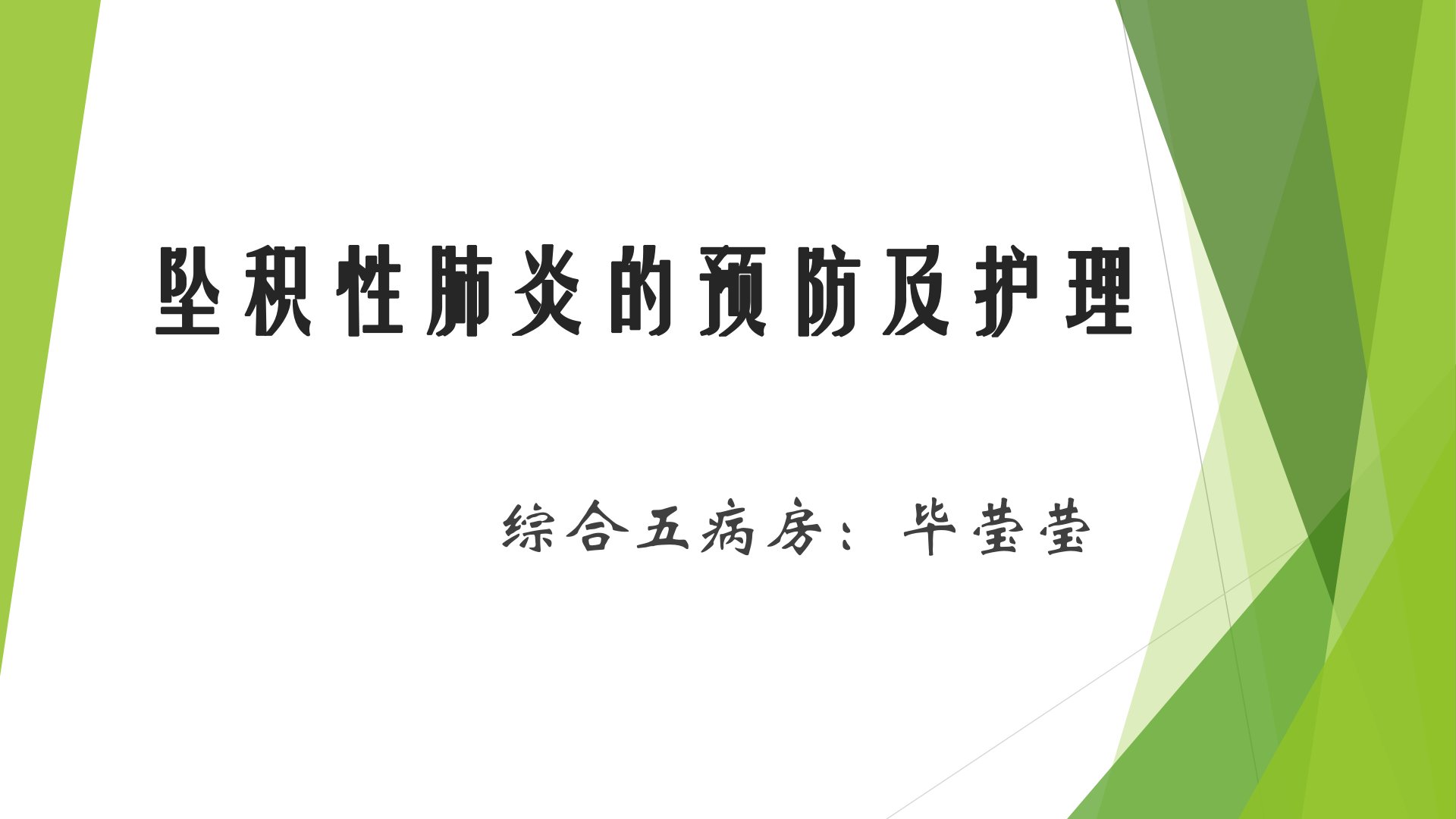 综合五病房毕莹莹医生介绍了坠积性肺炎的预防及护理。学习目标包括掌握坠积性肺炎的定义、了解发病原因和临床表现、掌握预防及护理措施。坠积性肺炎是因患者长期卧床呼吸道分泌物难咯出淤积于中小气管而诱发的肺部感染性疾病。其病因包括年龄、长期卧床、呼吸肌麻痹、呼吸道清除功能减弱、侵入性操作及全身性因素等。临床表现有呼吸困难、发热、咳嗽咳痰、胸痛。预防护理措施包括:保持室内空气清新注意通风维持合适室温(1820)和湿度(5060);保持舒适体位采取坐位或半坐位;适当增加维生素及蛋白质摄入给予充足水分;促进有效排痰如有效咳嗽、气道湿化、胸部叩击、体位引流、机械吸痰等;遵医嘱应用抗生素、止咳及祛痰药物并观察用药不良反应。
