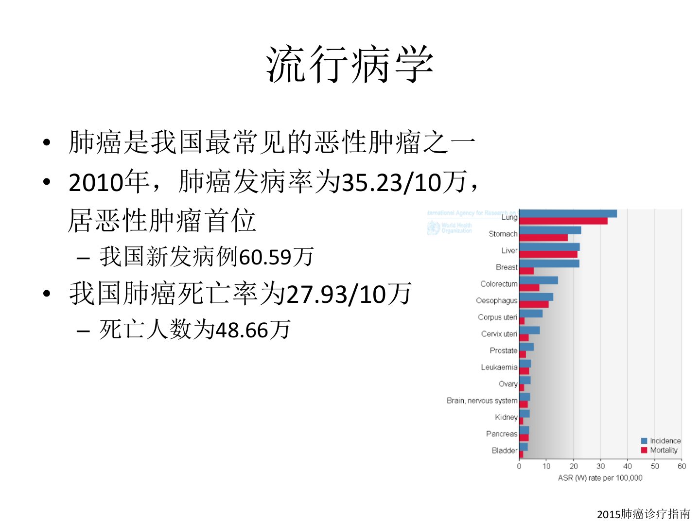 《NSCLC的规范化诊治——中国原发性肺癌诊疗规范(2015年版)解读》摘要肺癌是我国最常见的恶性肿瘤之一2010年发病率居恶性肿瘤首位。高危人群中开展肺癌筛查有益于发现早期肺癌提高治愈率。早期肺癌症状不典型常见刺激性干咳等症状呼吸道症状超两周且对症治疗不能缓解需高度警惕。肺癌诊断依赖多种检查胸部CT是重要影像手段PETCT是最佳方法之一还有支气管镜、纵隔镜、胸腔镜等检查以及血清学肿瘤标志物检测。明确病理学诊断需免疫组化等检测还要做EGFR与ALK基因检测。NSCLC的TNM分期采用国际肺癌研究协会2009年第七版分期标准第八版有更新使评判预后更加精确。治疗上手术方式多样强调完全性切除。术前全面评估决定手术方案有严格手术适应症和禁忌症。放疗可用于多种情况大分割放射治疗对因医学条件不适合手术或拒绝手术的I期NSCLC患者有效。药物治疗含一线、二线、三线含铂两药方案是标准一线化疗方案EGFR或ALK基因阳性患者可选择靶向药物。多学科综合治疗(MDT)分期治疗模式针对不同分期患者制定策略。治疗后需定期随访。