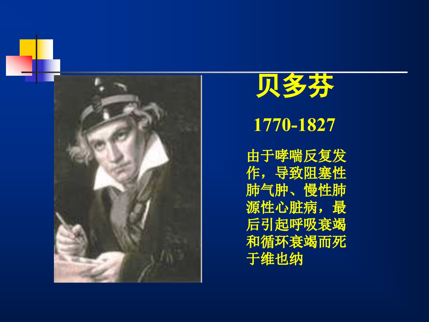 支气管哮喘摘要支气管哮喘是一种慢性气道炎症性疾病易感者对各种激发因子具有气道高反应性特征为可逆性气道阻塞和气道反应性增高。哮喘反复发作可导致阻塞性肺气肿、慢性肺源性心脏病严重时引起呼吸衰竭和循环衰竭。哮喘的病因多样包括室尘螨、动物皮屑、花粉、真菌、冷空气、病毒性上呼吸道感染、药物、食物添加剂等诱因。临床表现包括喘息、气急、胸闷或咳嗽双肺可闻及呼气相哮鸣音严重者有张口呼吸、端坐呼吸等症状。诊断主要依据反复发作的症状、体征及肺功能检查。治疗目标是控制症状、防止加重、维持肺功能、保持正常活动能力并避免药物不良反应。常用药物包括支气管舒张药(如2受体激动剂、抗胆碱能药物、茶碱类)和抗炎药(如糖皮质激素、白三烯调节剂)。哮喘需长期管理患者应定期随访适当锻炼科学饮食避免诱发因素。通过规范治疗和管理哮喘患者可像正常人一样生活、工作和学习。