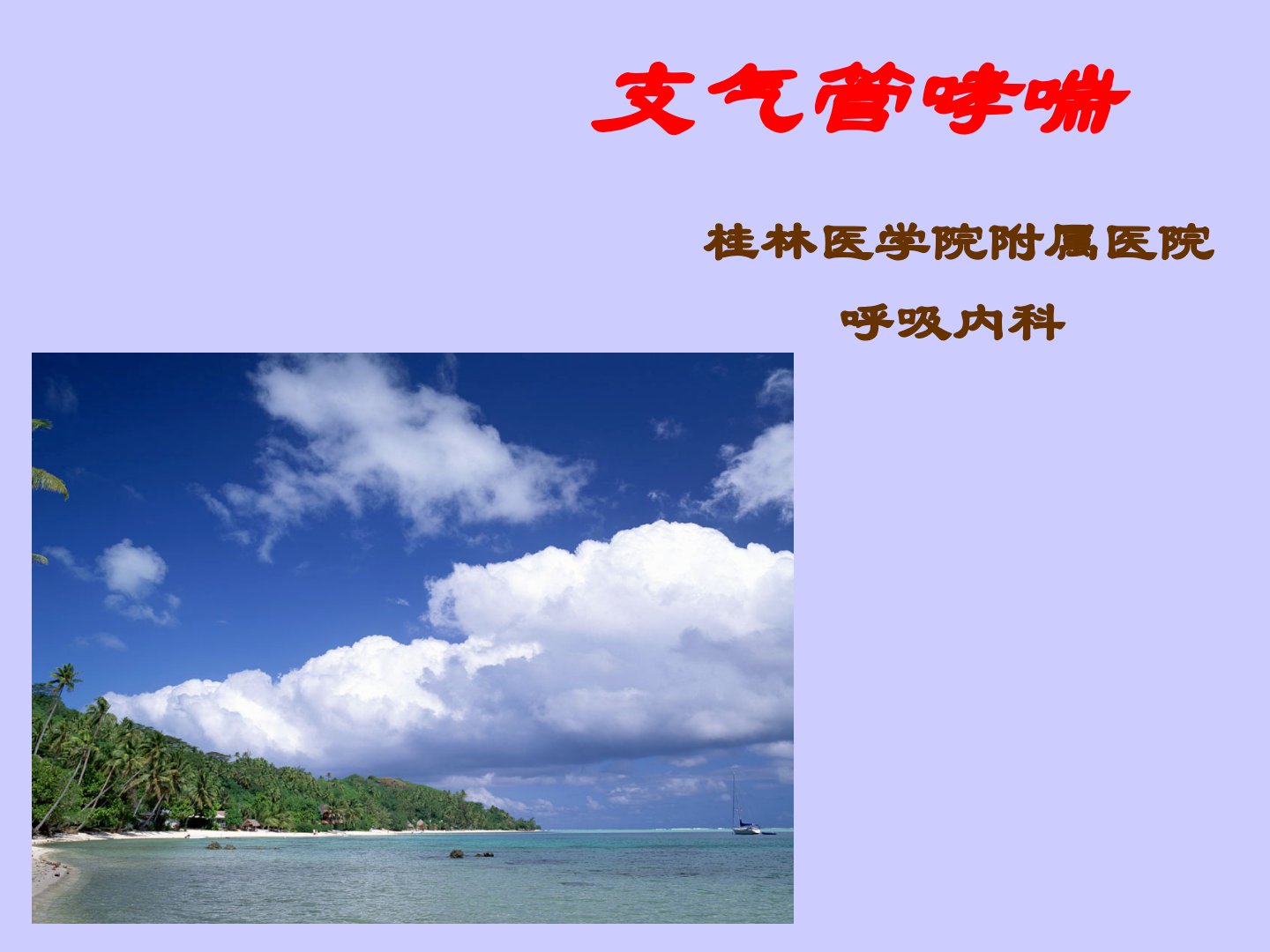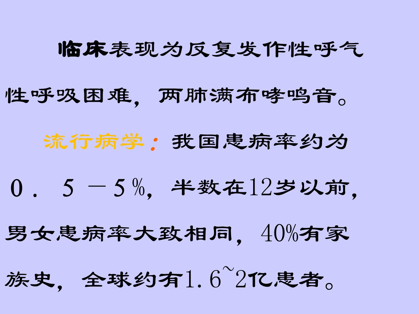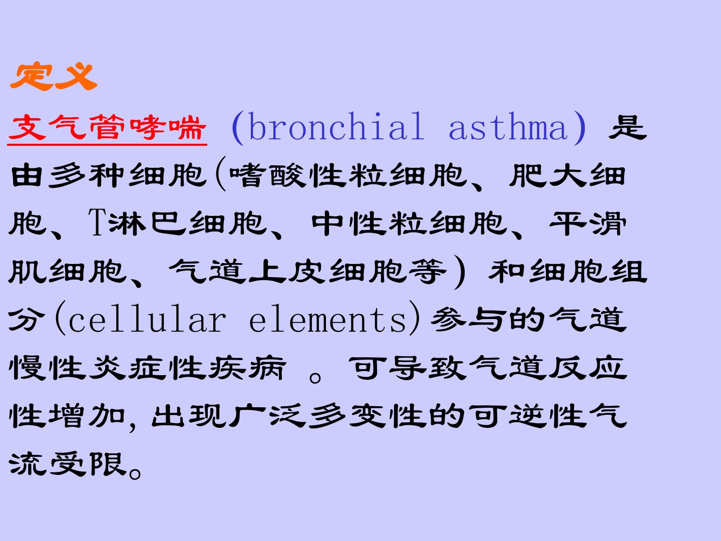 支气管哮喘桂林医学院附属医院呼吸内科定义支气管哮喘(bronchialasthma)是由多种细胞(嗜酸性粒细胞、肥大细胞、T淋巴细胞、中性粒细胞、平滑肌细胞、气道上皮细胞等)和细胞组分(cellularelements)参与的气道慢性炎症性疾病。可导致气道反应性增加,出现广泛多变性的可逆性气流受限。临床表现为反复发作性呼气性呼吸困难,两肺满布哮鸣音。流行病学:我国患病率约为0.5—5%,半数在12岁以前,男女患病率大致相同,40%有家族史,全球约有1.6~2亿患者。病因:病因不明,受遗传和环境因素的双重影响。发病机理:1、气道免疫-炎症机制:体液介导的和细胞介导的免疫反应均参与哮喘的发病。抗原...